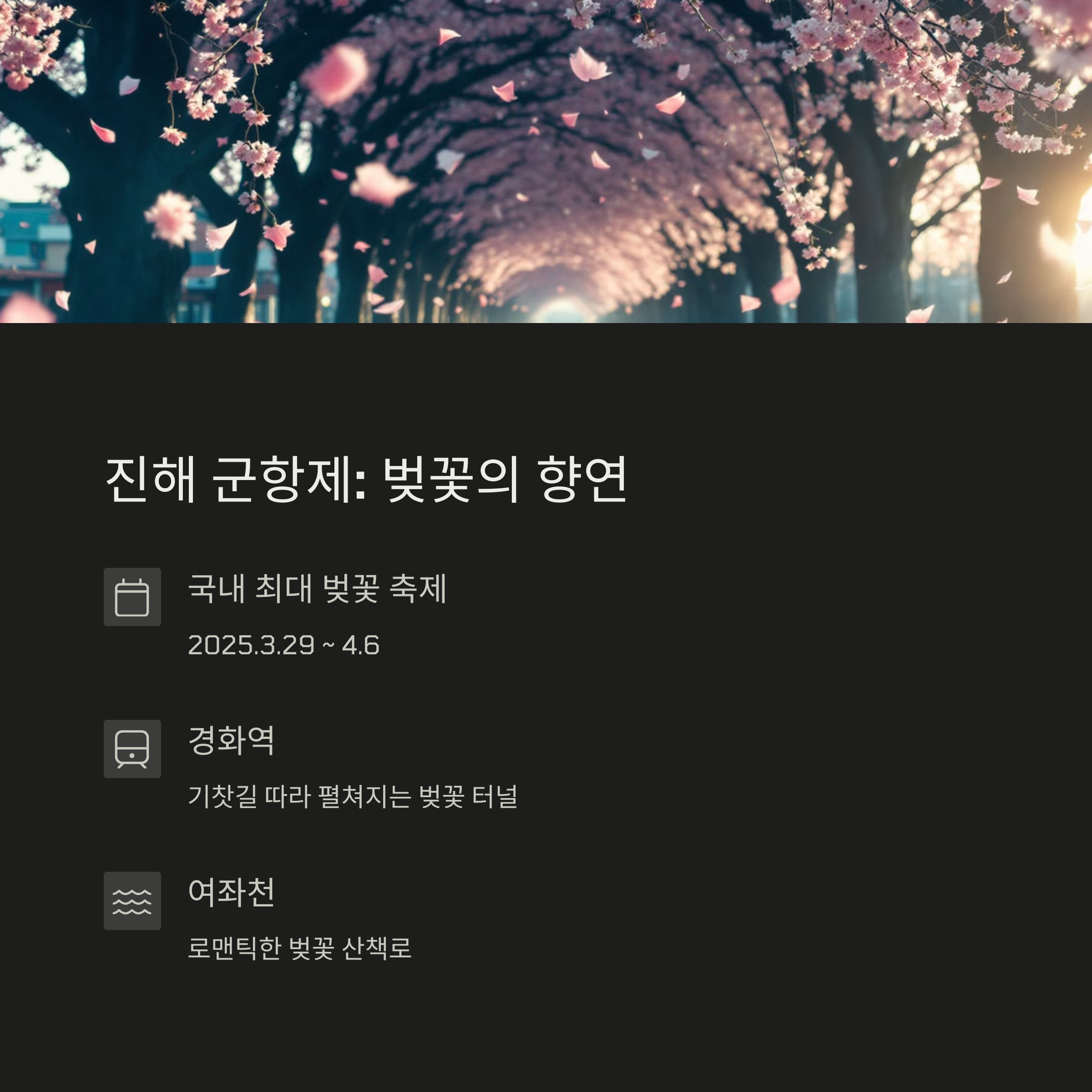 | 진해 군항제 | 제주 유채꽃 | 여의도 벚꽃 |