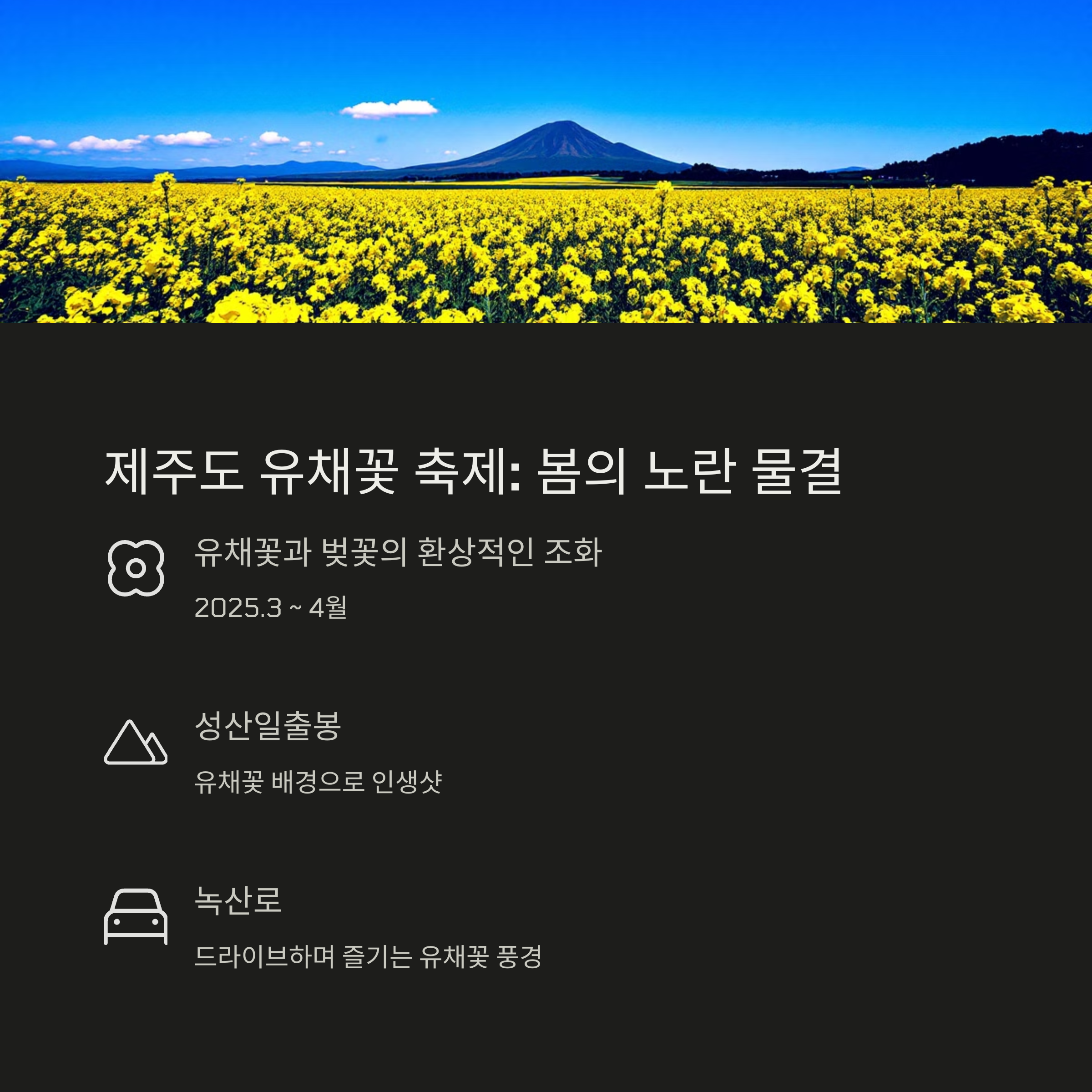 제주도 유채꽃 + 벚꽃을 모두 보고 싶다면 3월 말~4월 초 녹산로, 성산일출봉, 전농로를 중심으로 코스를 잡아보세요. 여성 전용 게스트하우스, 렌트카, 버스 투어를 활용하면 혼자서도 편안하고 안전한 여행이 가능합니다. 유채꽃밭에 앉아 책 읽기, 소품과 함께 사진 찍기 등 혼자만의 시간을 충분히 즐길 수 있어요.
