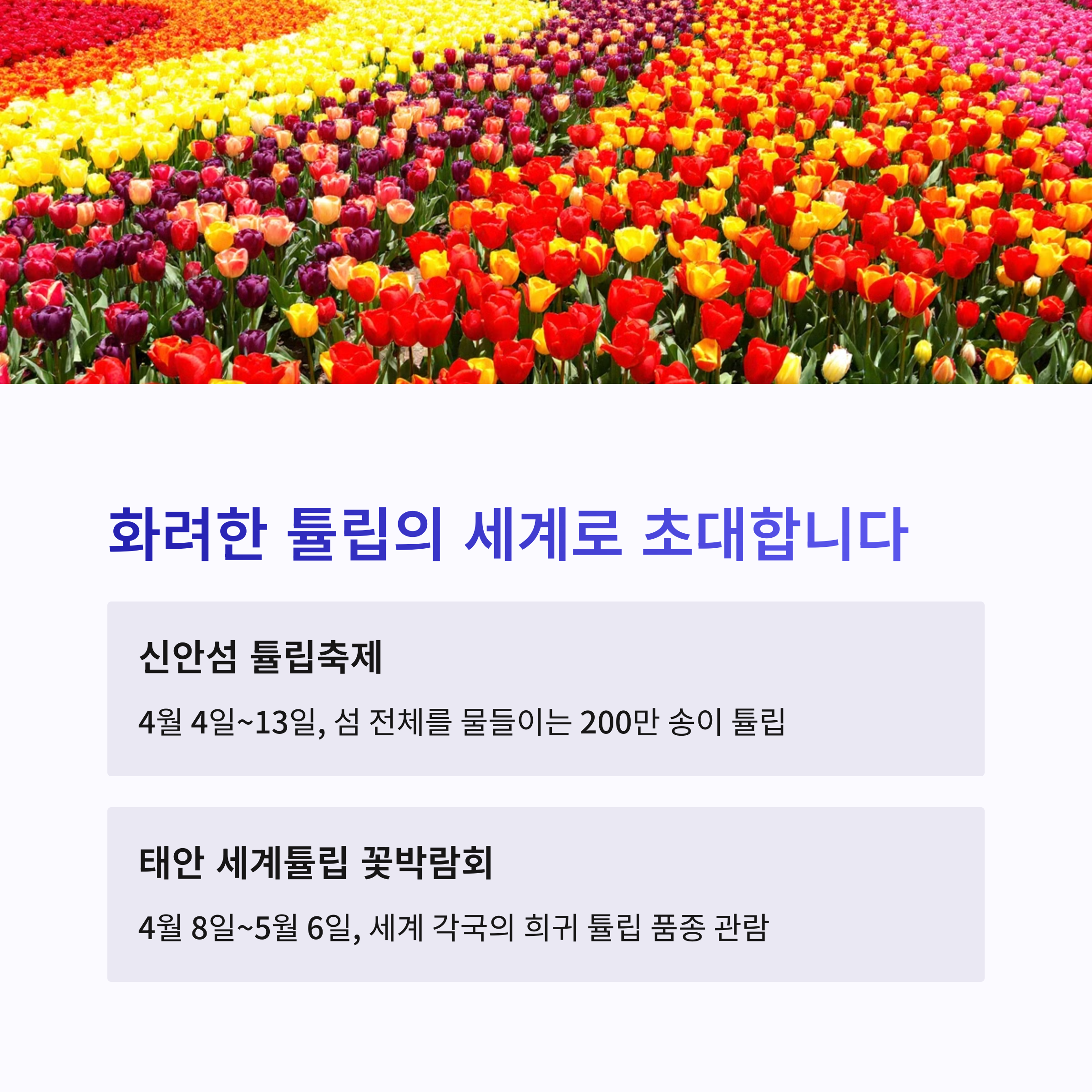 튤립을 좋아한다면 신안섬 튤립축제(4.4~4.13)태안 세계튤립꽃박람회(4.8~5.6)를 추천합니다. 형형색색의 튤립과 이국적인 포토존이 많아 인생샷을 남기기에 좋아요. 바다와 꽃이 함께하는 풍경 덕분에 SNS 인기 스팟으로도 떠오르고 있습니다.