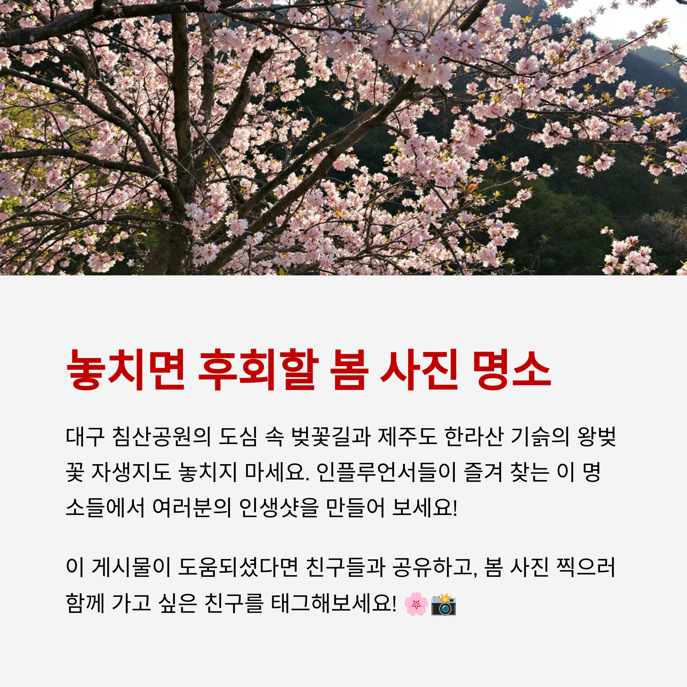 봄이 오면 많은 이들이 기다리는 풍경 중 하나는 바로 화사한 꽃들로 가득한 명소에서의 인생샷입니다. 서울의 윤중로부터 제주까지, 대한민국 곳곳에는 매년 봄마다 장관을 이루는 꽃축제와 더불어 포토스팟이 가득합니다. 이번 포스팅에서는 인플루언서들이 직접 다녀온, 인증한 국내 봄 사진 명소를 소개드립니다. 사진 속에서 봄을 간직하고 싶은 분들께 도움이 되기를 바라며, 당신만의 아름다운 봄날을 남길 수 있는 장소들을 함께 알아보겠습니다. 꽃의 계절, 새로운 계절, 봄. 자연이 만들어낸 색감 속에서 사진 한 장에 추억을 담아보세요. 벚꽃, 유채꽃, 산수유 등 다양한 봄꽃이 만발하는 지금, 찰나의 계절을 완벽하게 기록할 수 있는 장소들을 정리해 드립니다. 인생샷을 위한 정보, 지금부터 시작합니다.