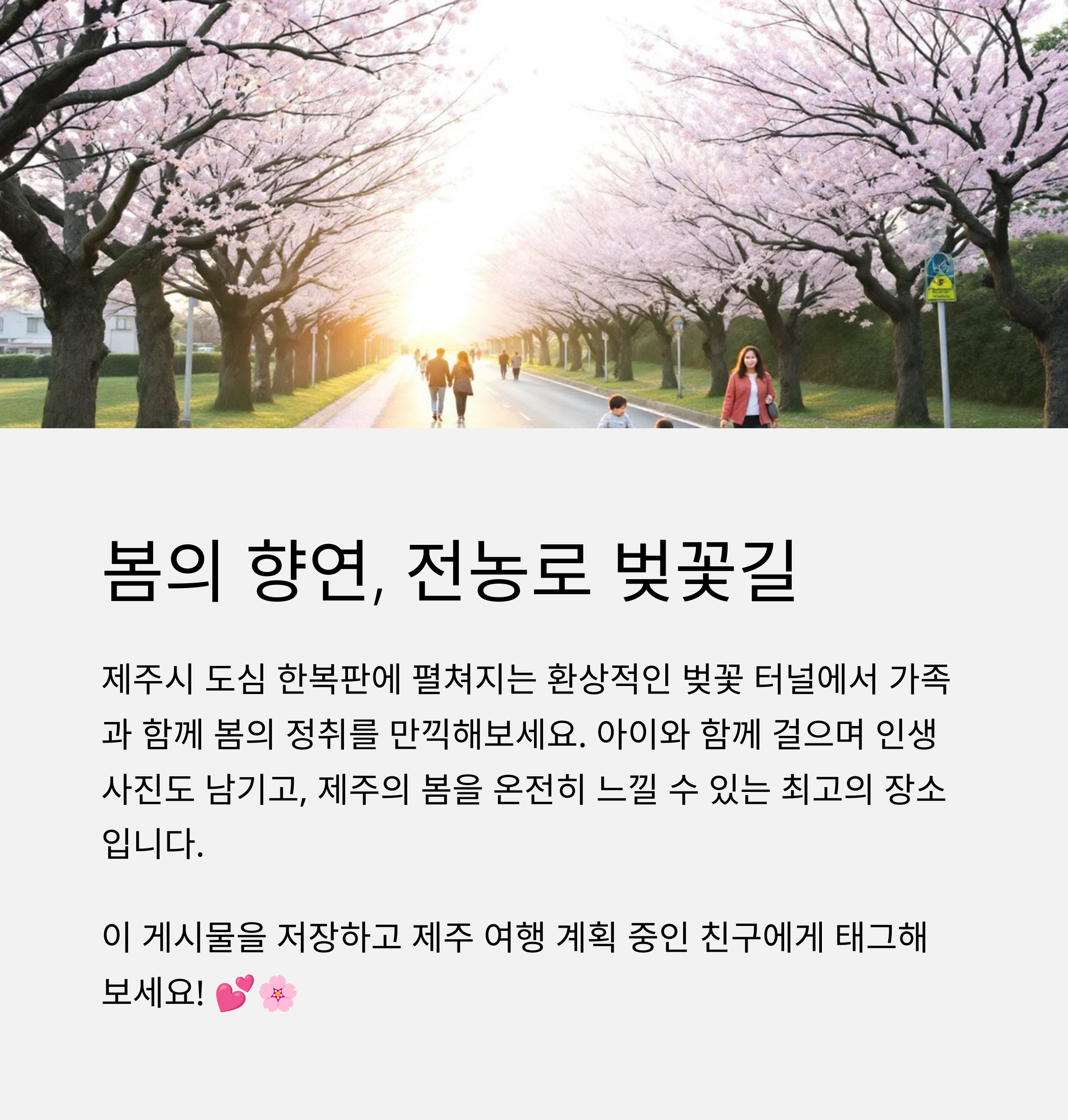 제주시 도심 속에 위치한 전농로 벚꽃길은 봄철에 더욱 빛나는 가족 산책로입니다. 흐드러진 벚꽃과 함께 산책을 즐기며, 곳곳에서 인생샷도 남길 수 있어 인기 있는 포토 스폿으로 손꼽힙니다. 실내에서 충분히 즐긴 후 야외에서 자연과 함께하는 일정을 구성하면 아이들과의 추억이 더욱 풍성해집니다. 날씨에 따라 유동적으로 조정 가능한 여행 코스이기에, 봄철 제주 여행을 보다 알차게 만들어 줄 것입니다.