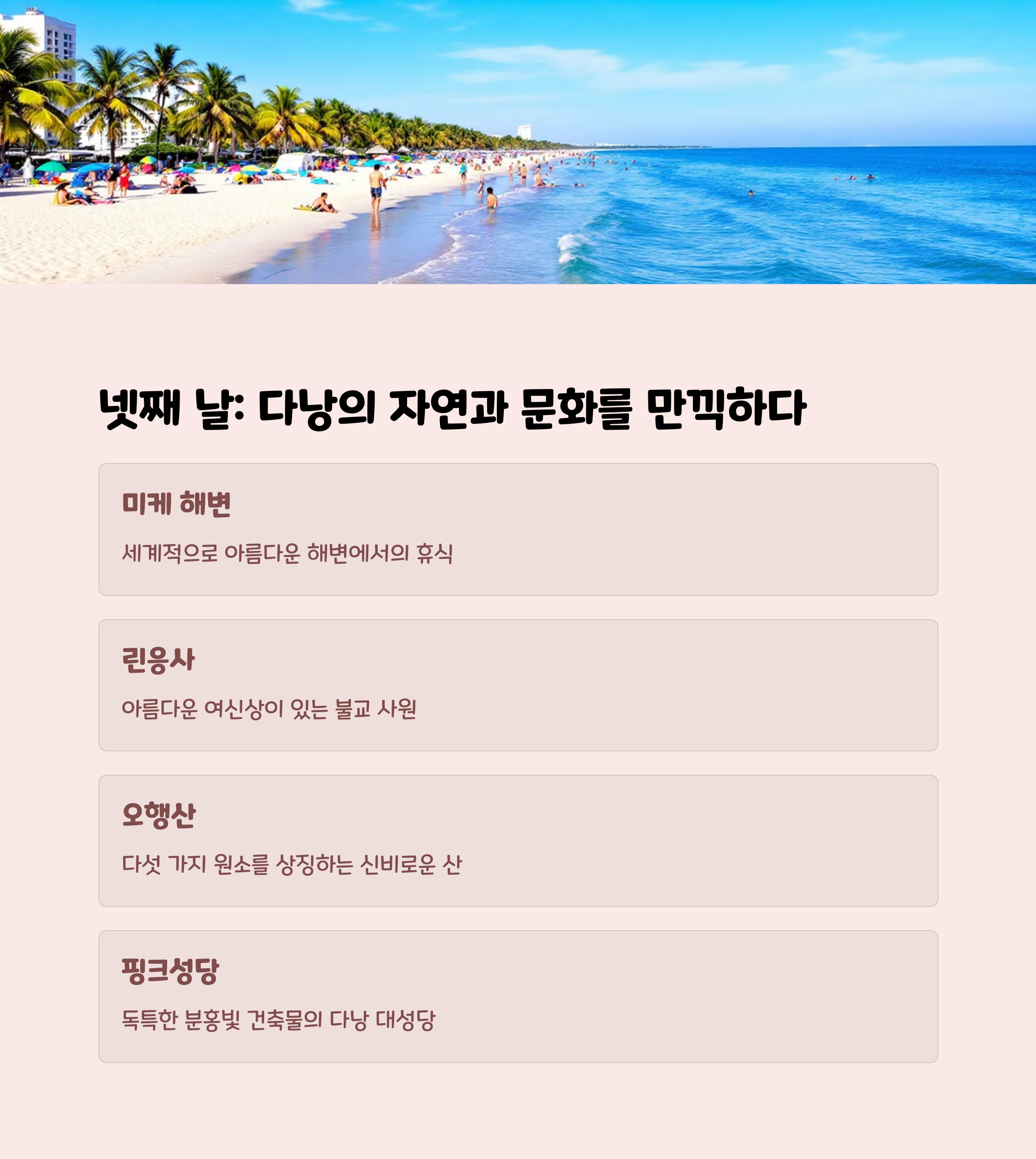 여러분이 다낭에서 경험했던 장소나 맛집, 또는 자유여행 중 겪었던 유익한 팁이 있다면 댓글을 통해 함께 공유해 주세요. 서로의 여행이 더욱 풍성해지는 계기가 될 거예요.