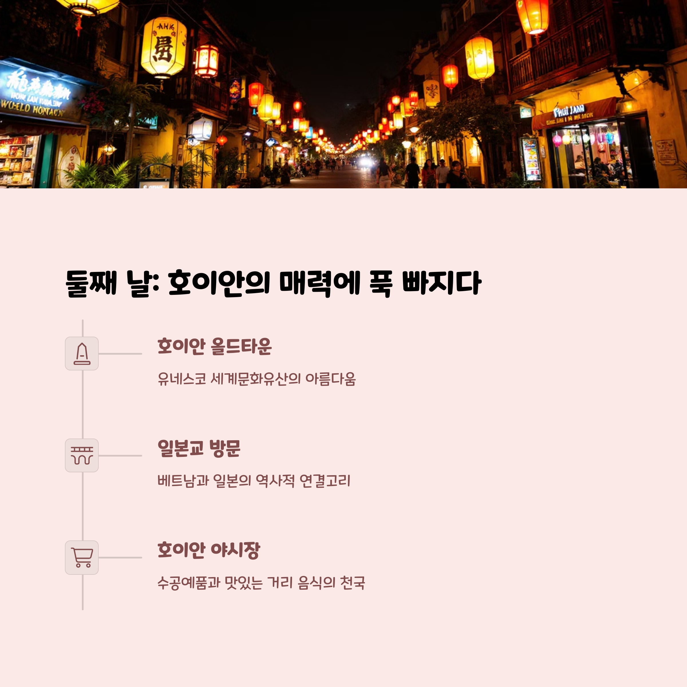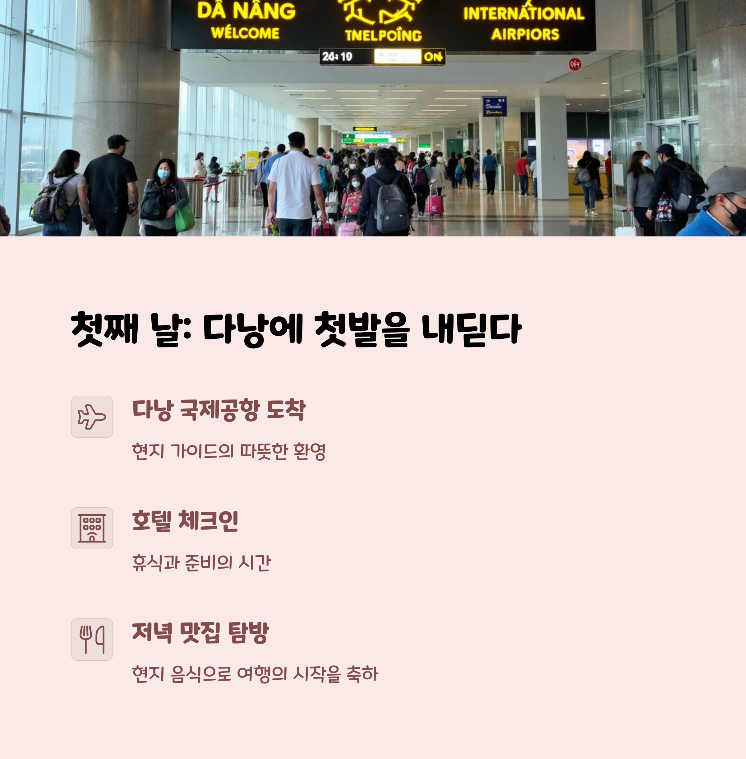 여행 일정은 총 3박 5일 코스로 구성되어 있습니다. 첫째 날은 다낭 공항에 도착한 뒤 호텔에 체크인하고, 여유로운 자유 시간을 즐기며 주변을 둘러보는 것으로 시작합니다. 둘째 날은 호이안 올드타운을 중심으로 한 역사적인 마을을 탐방하며, 야경과 야시장을 함께 즐기는 일정으로 이어집니다. 셋째 날은 바나힐로 이동하여 유럽풍 테마파크와 케이블카를 체험하고, 오후에는 핫스톤 마사지로 피로를 풀 수 있는 시간을 제공합니다. 마지막 날은 미케 해변과 다낭 시내 중심지를 돌아보며 여행을 마무리하게 됩니다.