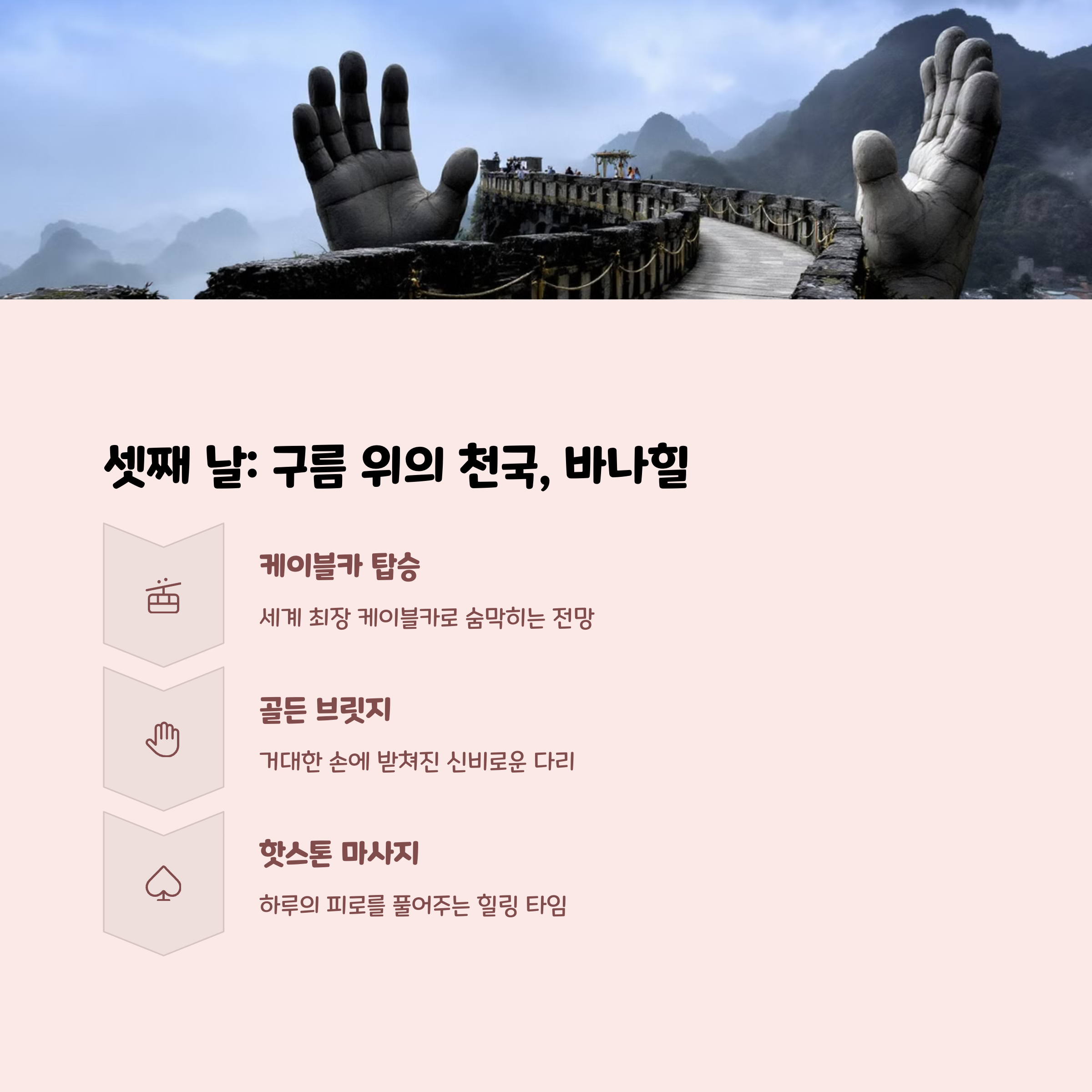 | 평균 23~28도, 쾌적한 여행 기후 | 3박 5일 코스로 알찬 일정 구성 | 현장 문제 발생 시 실시간 해결 가능 |