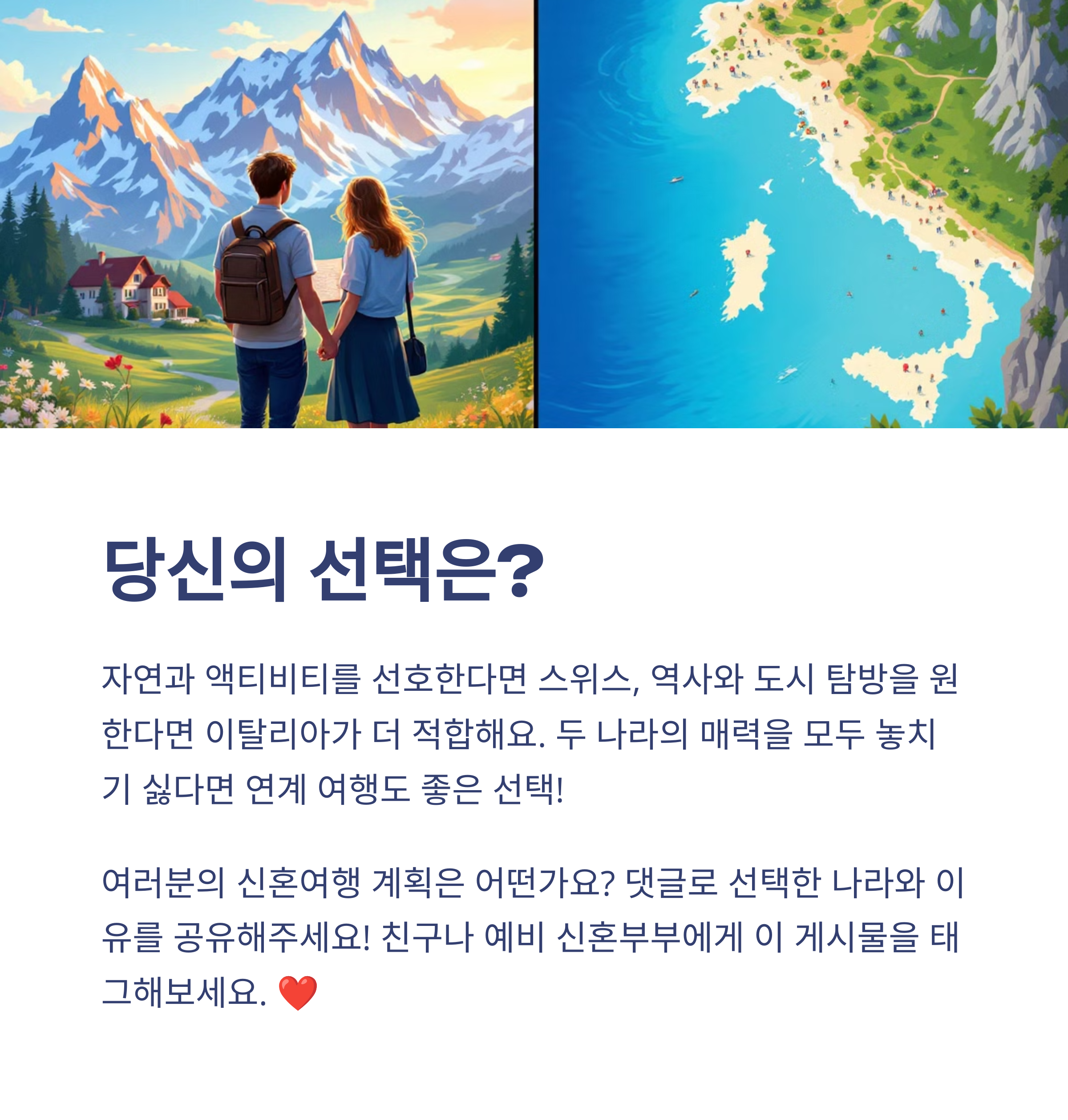 스위스 vs 이탈리아, 신혼여행지로 어느 쪽이 더 끌리셨나요? 이 글을 통해 각 나라의 분위기와 특징을 비교해보셨다면, 이제 여러분의 취향에 따라 진짜 원하는 로망 여행지를 결정할 수 있을 거예요. 자연과 함께 힐링하고 싶다면 스위스, 도시와 낭만을 만끽하고 싶다면 이탈리아! 어떤 선택이든 두 사람만의 첫 여행이기에 더욱 특별한 기억으로 남을 거예요.