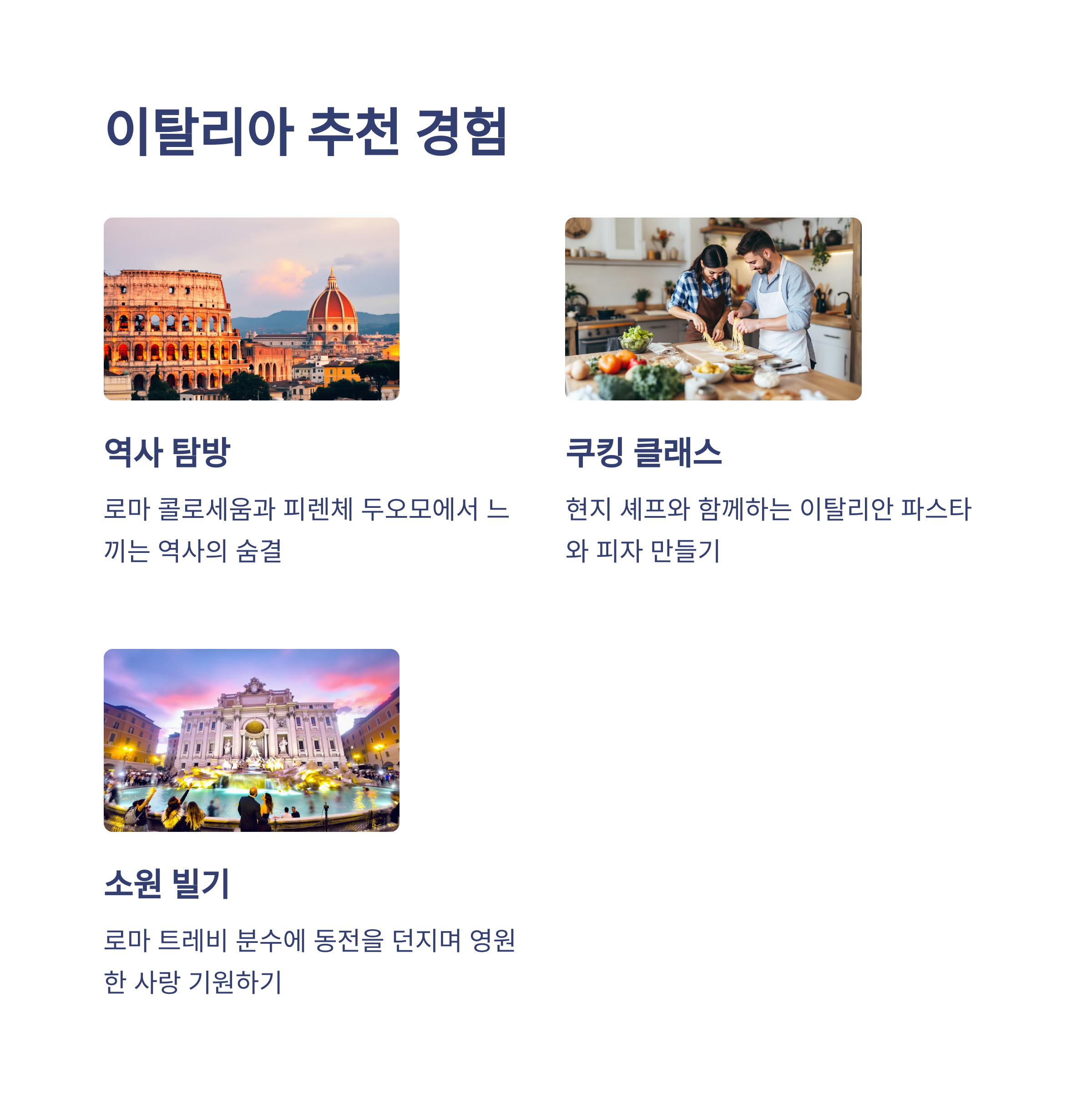 | 이탈리아 특징 | 역사 유적지, 와이너리, 도시 탐방 중심의 낭만적 분위기 |