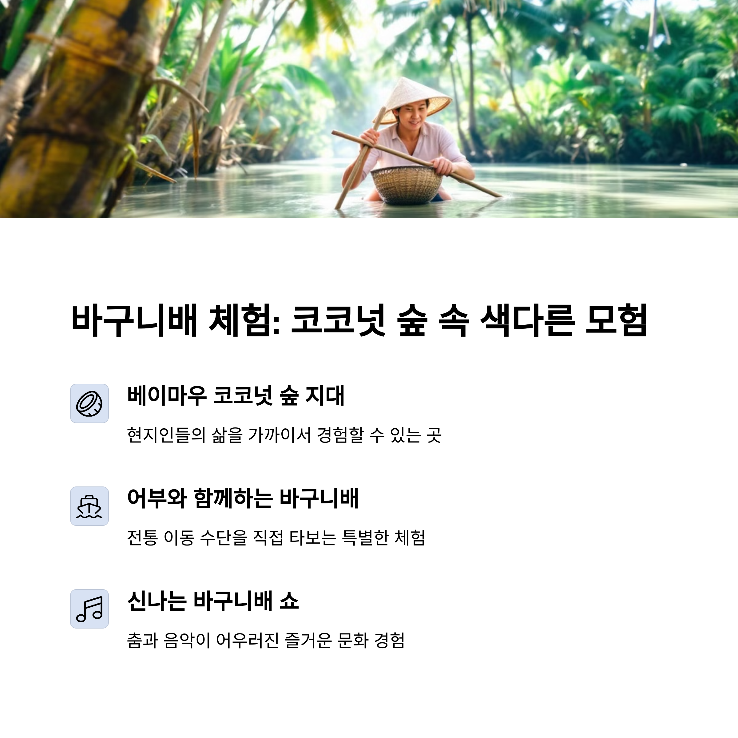 | 바구니배 체험 | 코코넛 숲 탐험 + 현지인 쇼 즐길 수 있음 |