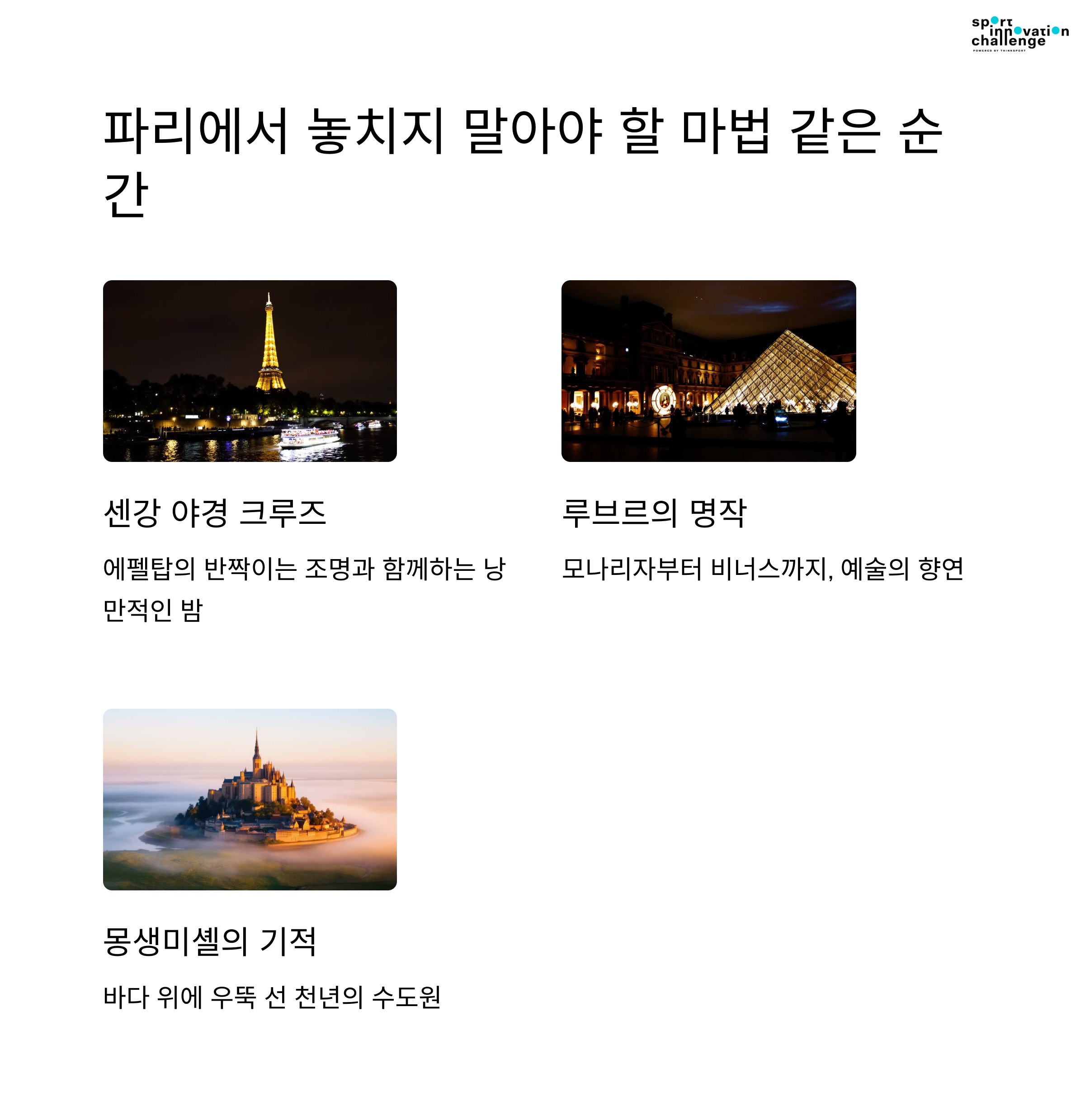 유럽 여행의 시작은 언제나 파리가 제격입니다. 첫날에는 에펠탑, 샹젤리제 거리, 개선문 등을 중심으로 파리만의 감성과 건축미를 느낄 수 있는 코스를 추천합니다. 2일차에는 루브르 박물관에서 예술을 감상하고 몽마르트 언덕과 노트르담 대성당을 돌아보며 파리의 클래식한 매력을 만끽해보세요. 3일차에는 베르사유 궁전 또는 몽생미셸과 같은 근교 명소를 방문해 색다른 경험을 더할 수 있습니다.