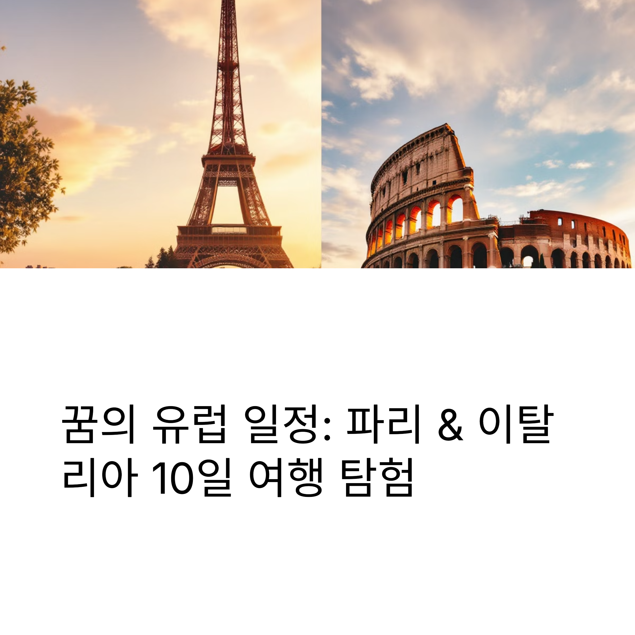 유럽 핵심 도시를 짧고 굵게 경험하고 싶다면 이 10일 코스는 정말 좋은 선택입니다. 파리의 감성과 예술, 이탈리아의 역사와 맛을 모두 담은 일정으로 알차게 구성해보세요. 이동만 전략적으로 잘 세우면 가족, 친구, 커플 여행 모두 만족할 수 있는 유럽 여행이 완성됩니다.