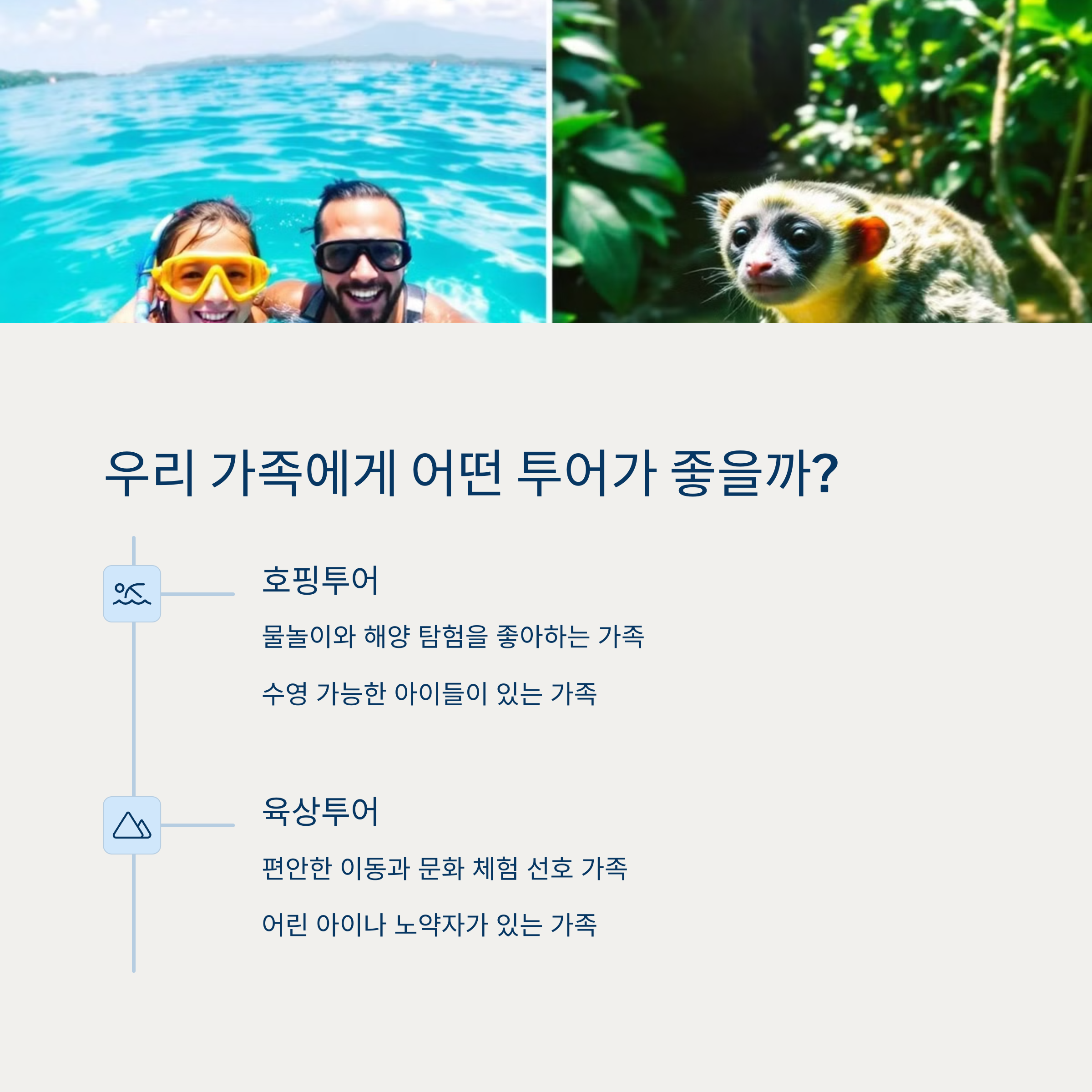 | 호핑투어 구성 | 육상투어 구성 | 가족에게 좋은 이유 |