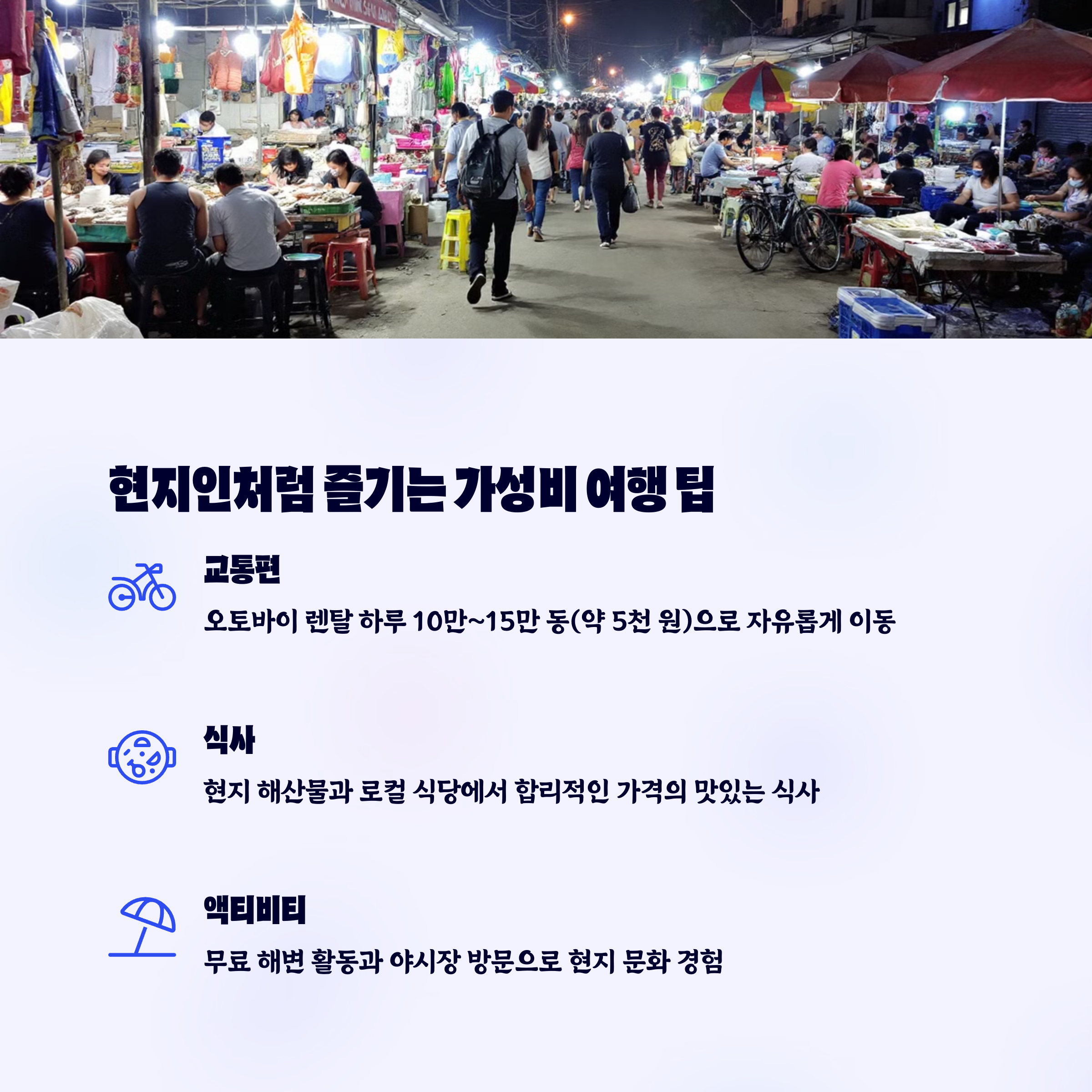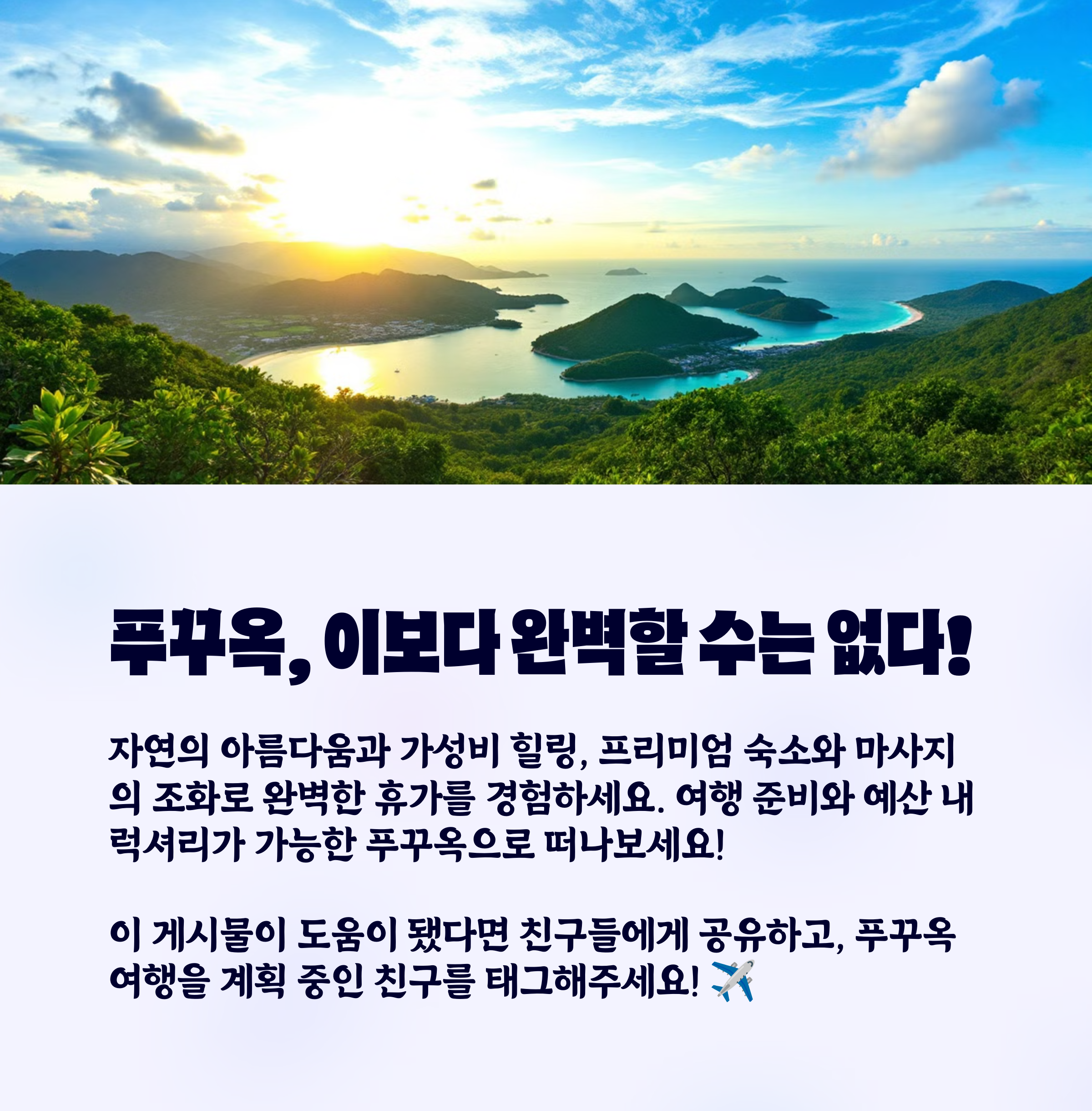 푸꾸옥 여행을 가성비 높게 즐기고 싶다면 숙소와 마사지 선택이 핵심입니다. 리조트는 고급스럽되 식비나 교통비는 절약할 수 있고, 마사지샵은 전문성과 가격을 모두 갖춘 곳을 고르면 여행의 피로까지 깔끔하게 해소됩니다. 여기에 야시장 구경, 무료 해변 산책, 현지 음식 체험 등을 더하면 예산 내에서 럭셔리한 여행이 가능합니다.