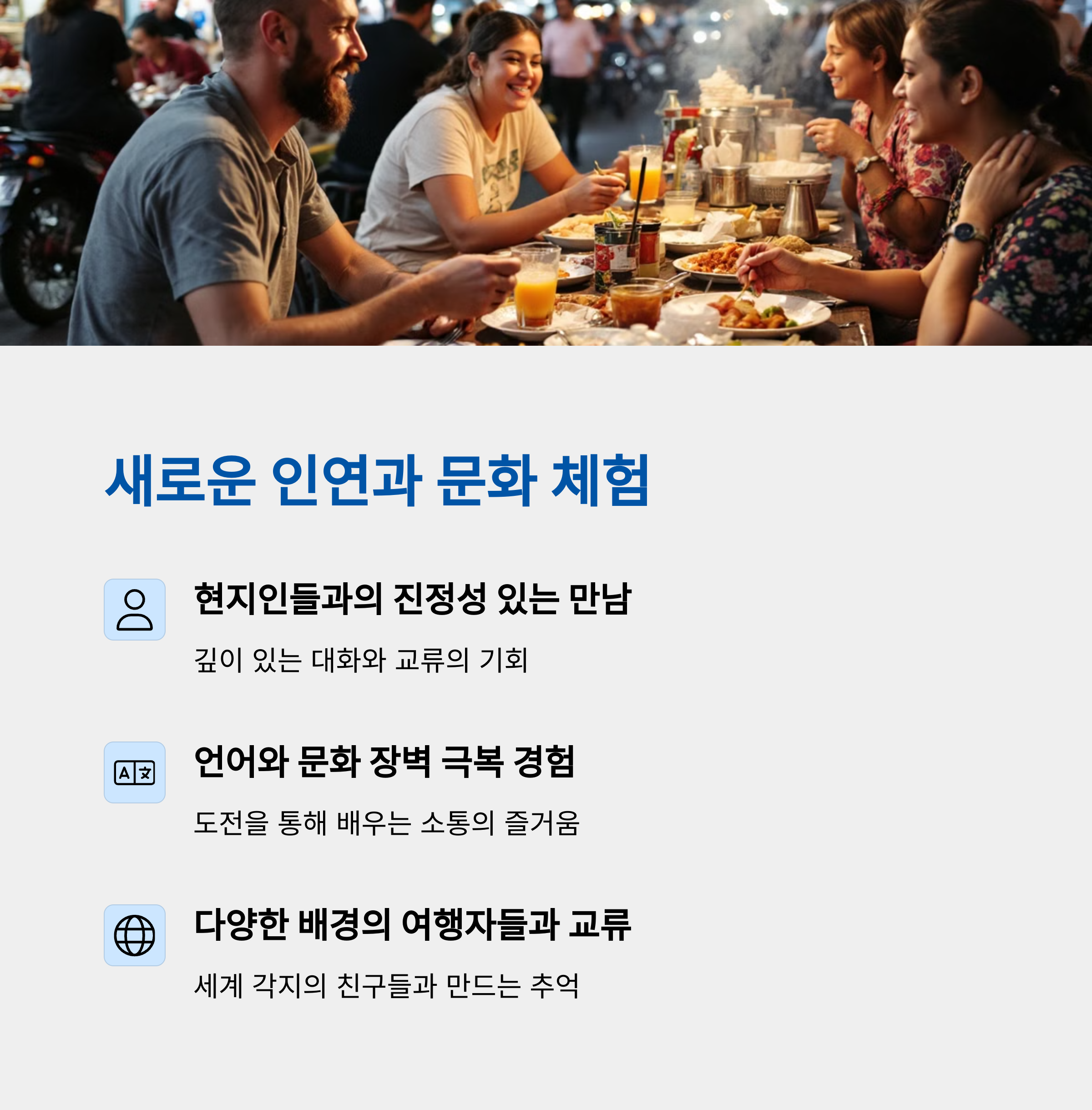 낯선 곳에서 다양한 사람들과의 만남 또한 혼행만의 묘미 중 하나입니다.