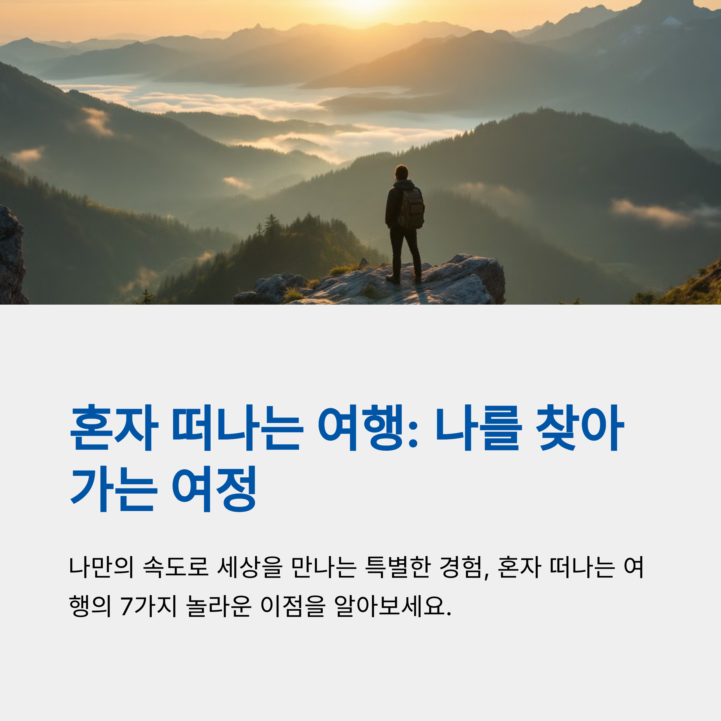 혼자 떠나는 여행은 단순한 휴식이 아닙니다. 그 시간 동안 우리는 스스로의 내면과 마주하고, 삶을 재정비하며, 새로운 영감을 얻을 수 있습니다. 처음엔 두렵고 망설여질 수 있지만, 한 번 그 세계를 경험하면 다시 떠나고 싶을 만큼의 매력을 지니고 있습니다. 당신도 지금 혼행을 꿈꾸고 있다면, 망설이지 말고 도전해보세요. 분명 삶에 잊지 못할 전환점이 되어줄 것입니다.