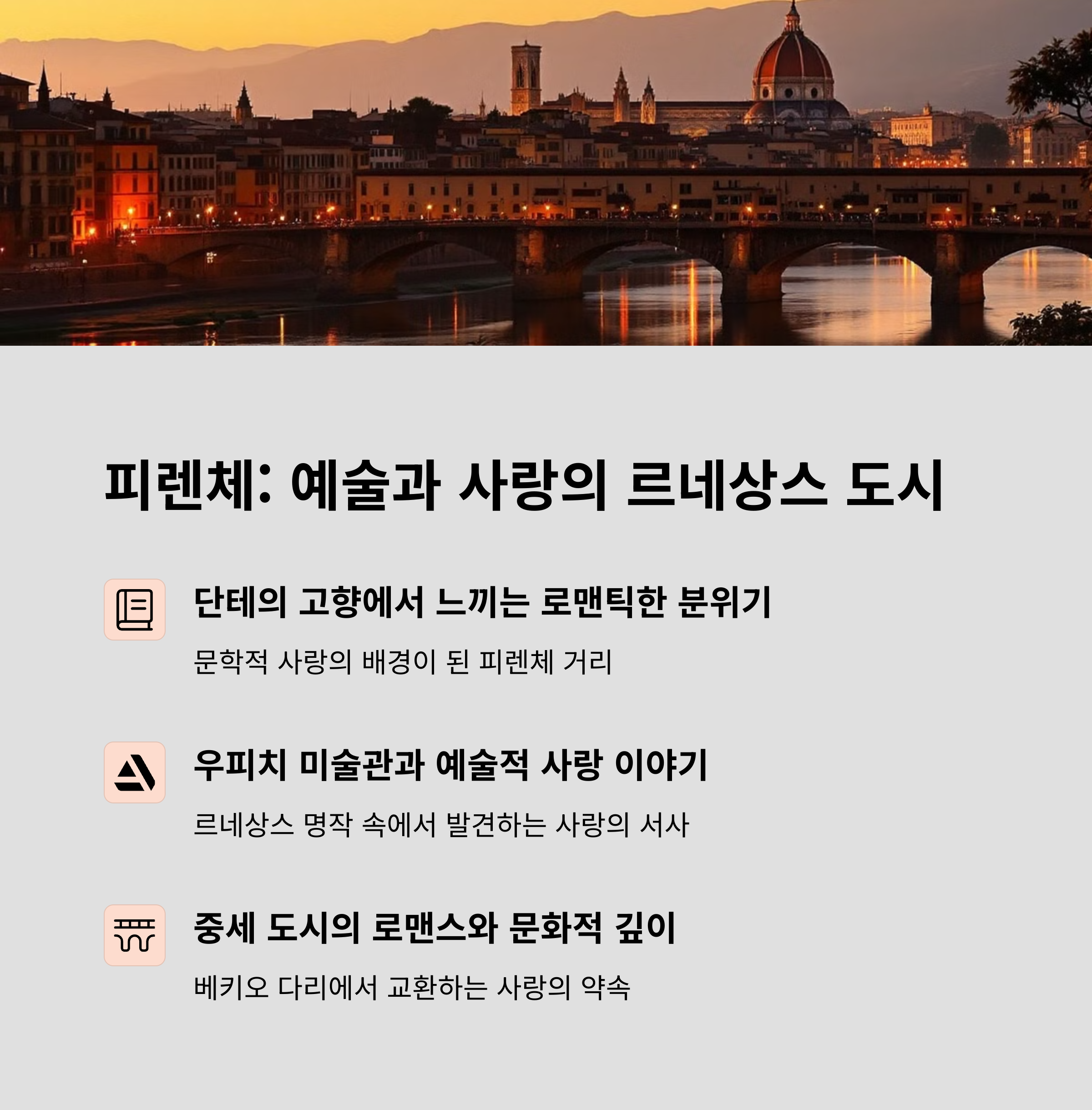 유럽의 매력은 계절마다 색이 다릅니다. 겨울에는 크리스마스 마켓이 도시를 빛나게 하고, 봄에는 유채꽃과 튤립이 길을 따라 피어납니다. 여름의 유럽은 축제와 음악으로 활기를 더하고, 가을에는 붉게 물든 자연이 도시의 고요함과 어우러지죠. 특히 이탈리아 피렌체는 단순한 관광지가 아닌, 감성을 자극하는 공간입니다. 단테의 시처럼, '냉정과 열정 사이'라는 감정의 흐름을 그대로 느낄 수 있는 도시랍니다.