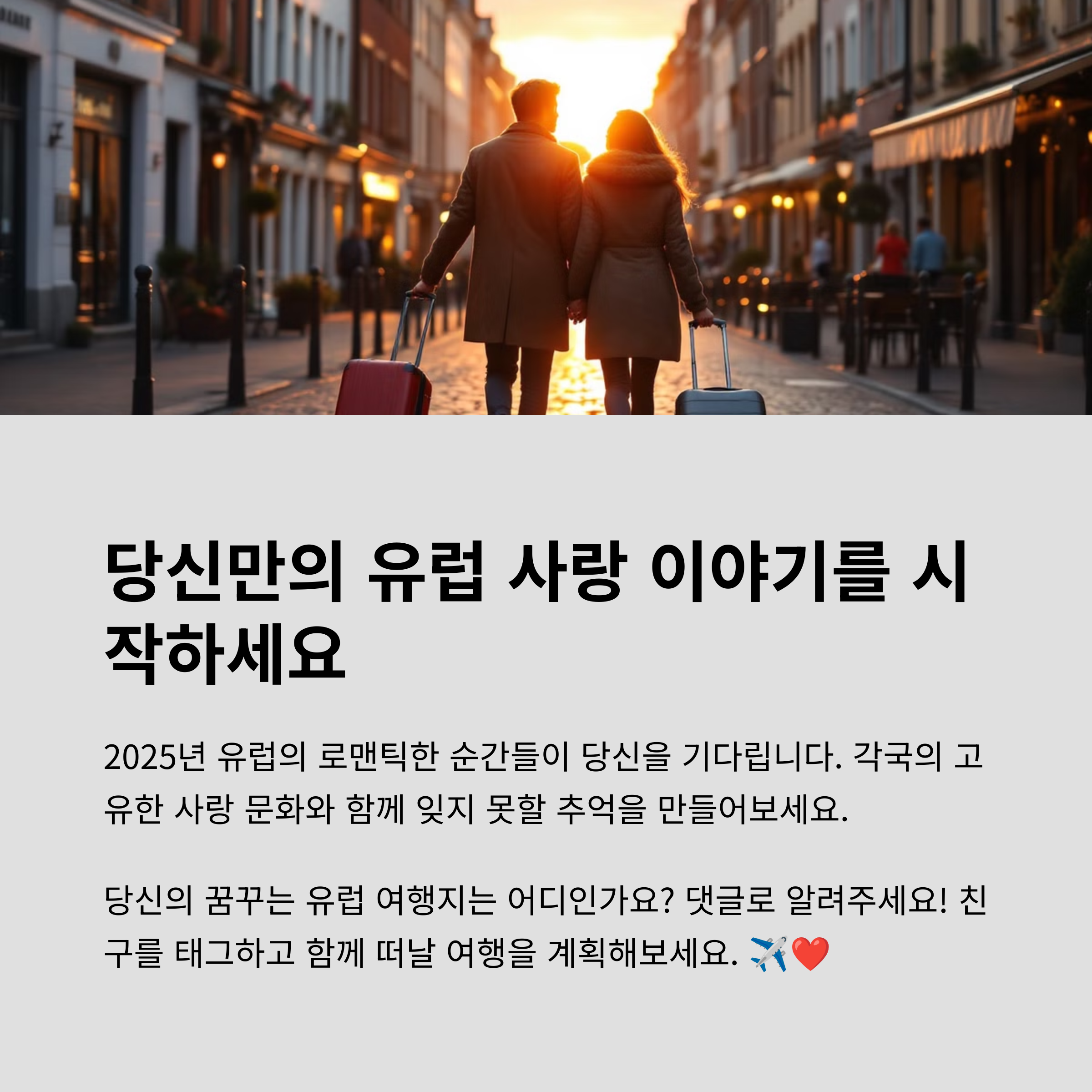 유럽은 그 자체로 한 편의 시이자 사랑 이야기입니다. 도시마다 다른 매력, 계절마다 달라지는 색감, 골목마다 펼쳐지는 이야기가 우리에게 특별한 감정을 선사하죠. 이번 글을 통해 여러분도 마음속 유럽과 사랑에 빠질 준비가 되셨기를 바랍니다. 언젠가 직접 그 길을 걸으며, 지금 이 감정을 다시 떠올릴 수 있기를 바랍니다.