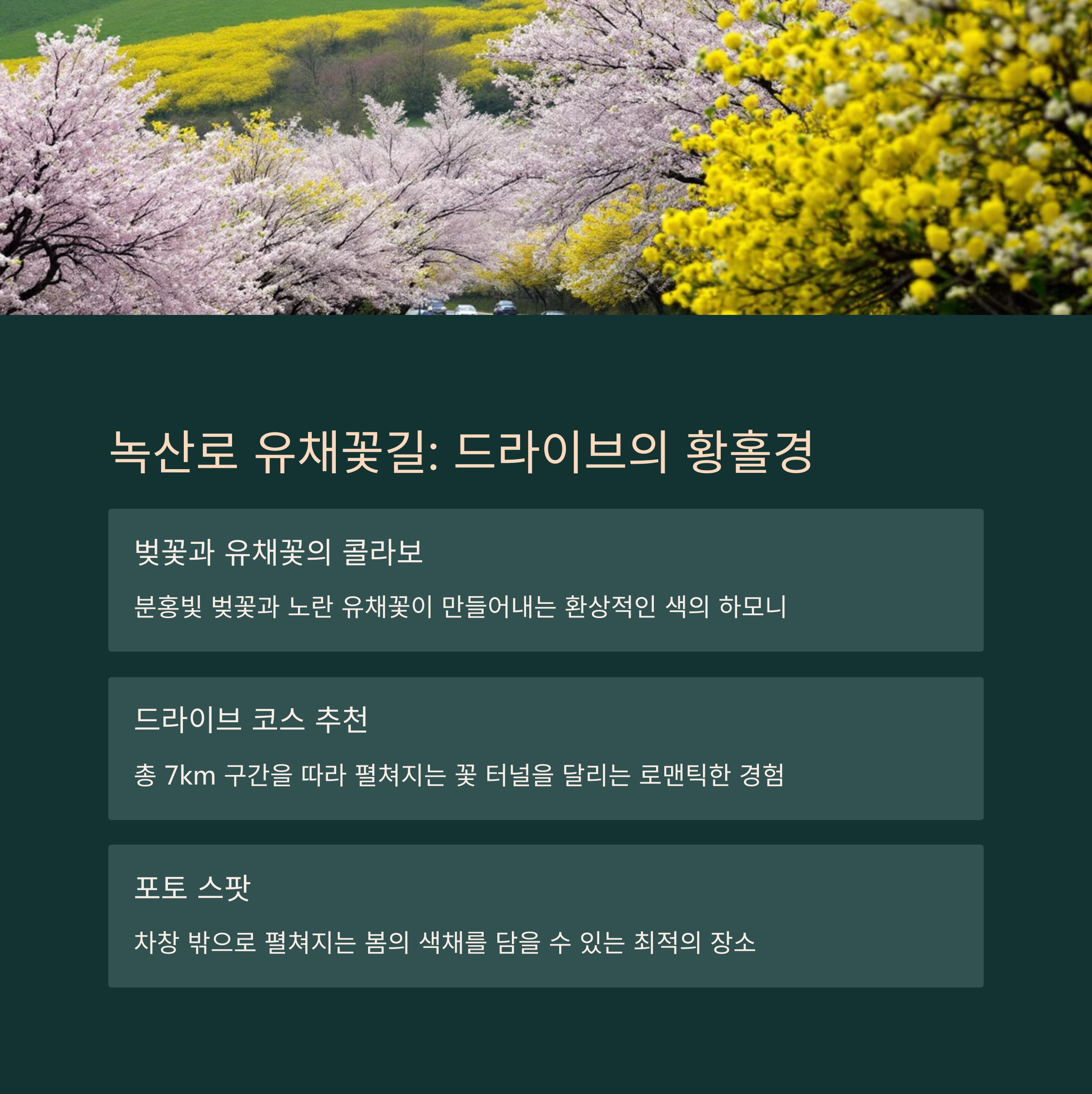 만약 드라이브를 즐기며 유채꽃을 감상하고 싶다면 녹산로가 제격입니다. 도로 양옆으로 펼쳐진 유채꽃과 함께 흐드러지는 벚꽃이 어우러져 환상의 풍경을 자아내죠. 자동차 창문을 열고 달리다 보면 봄바람과 꽃향기가 그대로 실려와 마음까지 설레게 만듭니다. 특히 이 길은 사진 찍기에도 좋아 많은 여행자들이 인생샷 명소로 추천하는 곳이랍니다.