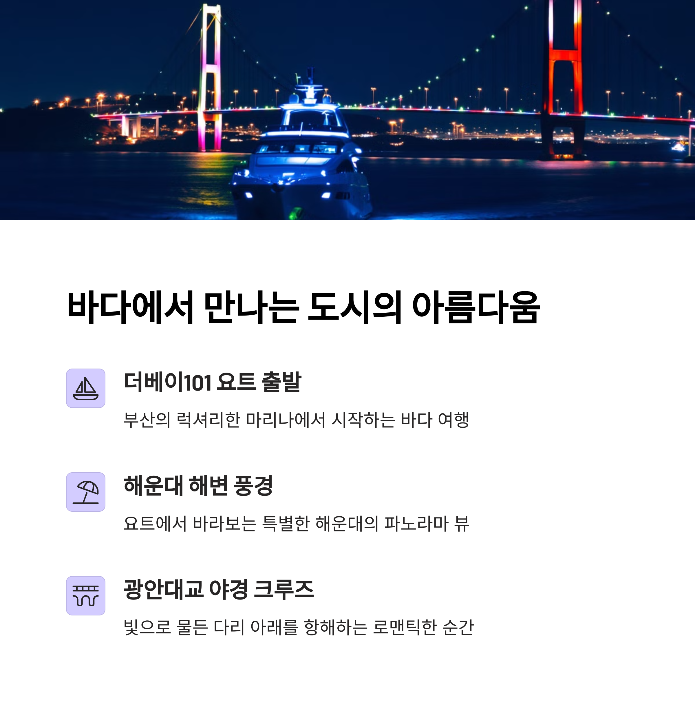 부산 요트투어는 낮에는 해운대와 광안리의 푸른 바다를, 밤에는 광안대교와 도심의 야경, 드론쇼까지 감상할 수 있는 럭셔리 체험입니다.