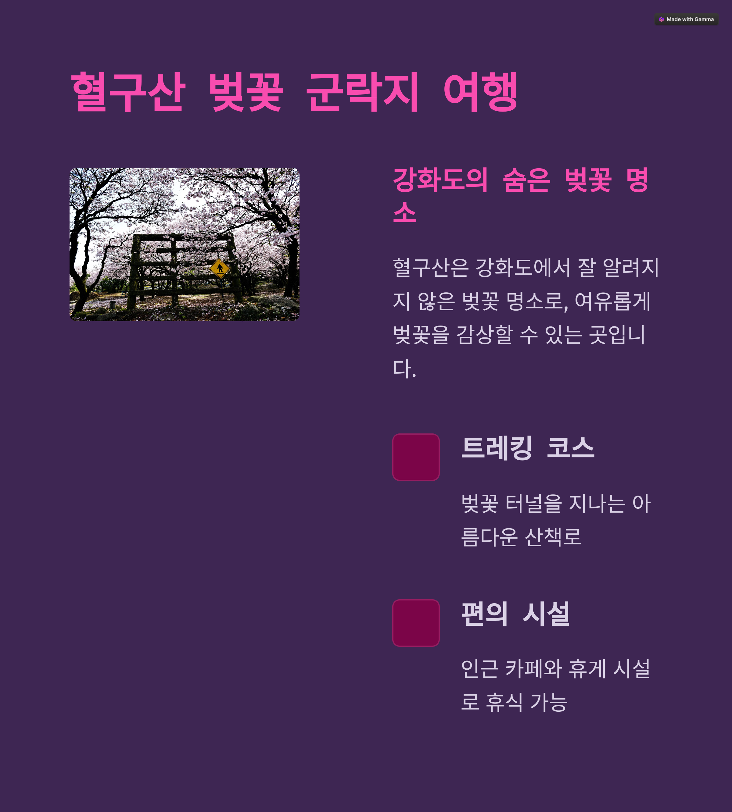 | 벚꽃 연계 코스 | 강화산성 북문길 → 고려산 진달래축제 → 혈구산 벚꽃길 |