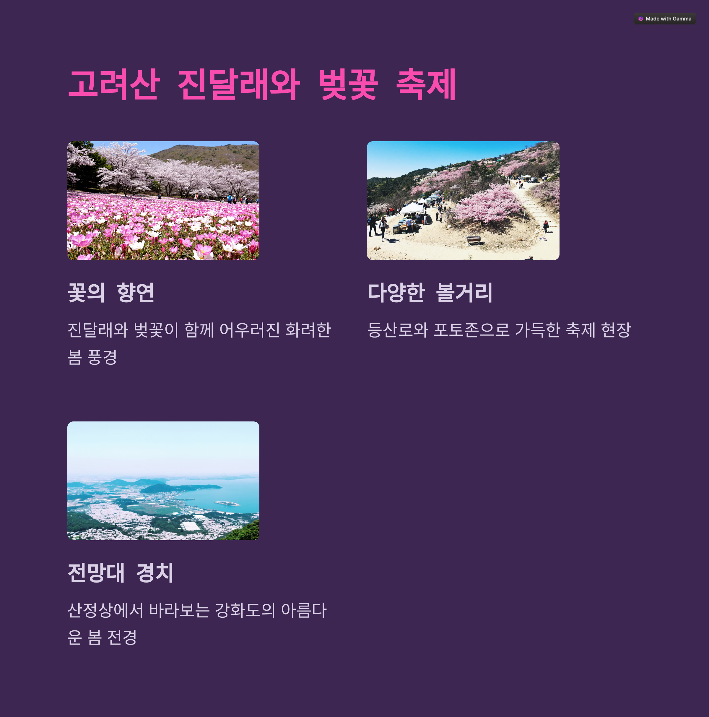| 개별 바비큐, 복층 구조, 픽업 서비스 확인 | 강화산성 북문길, 혈구산 벚꽃길, 고려산 진달래 | 오전 벚꽃 → 낮 산책 → 저녁 드라이브 코스 |