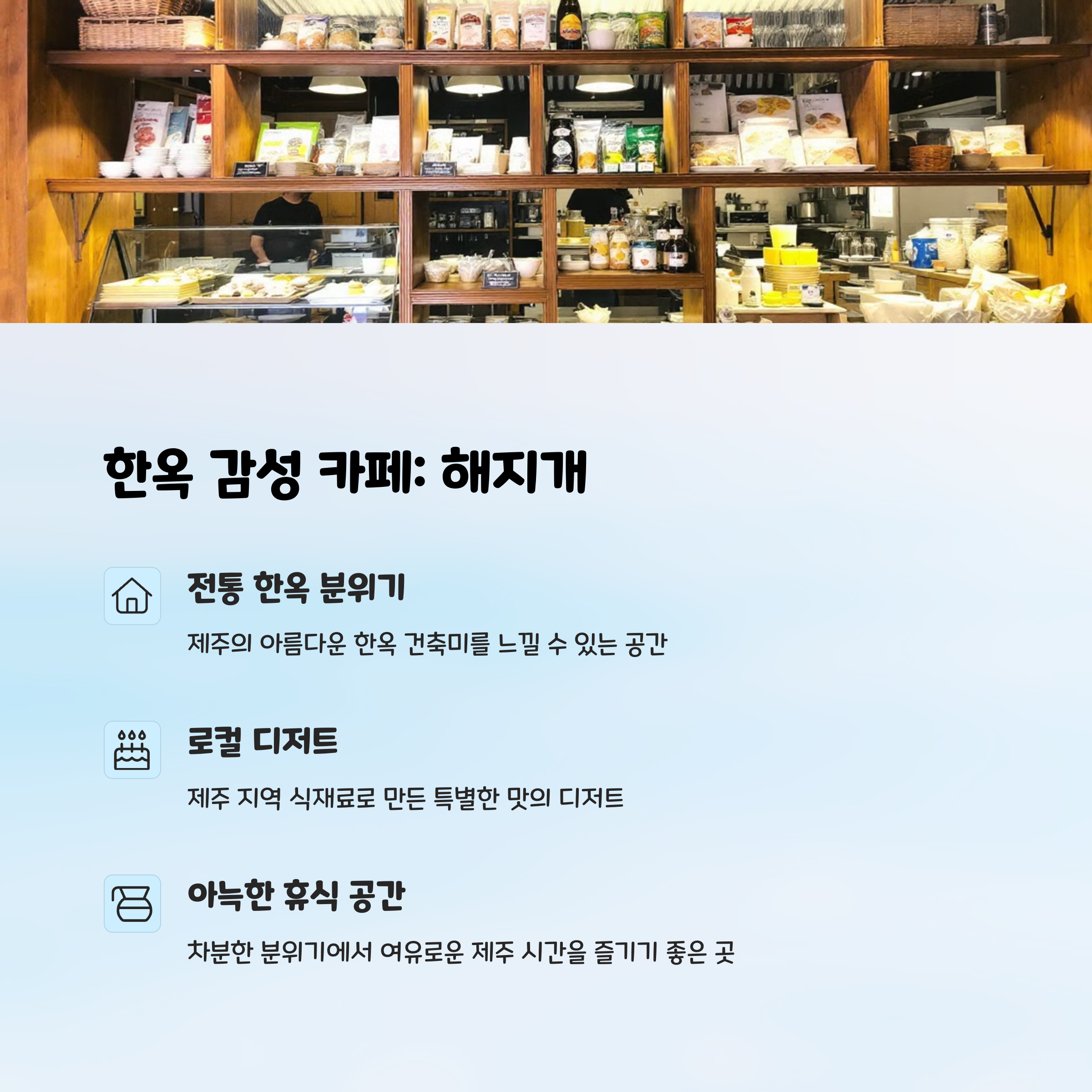 | 추천 카페 | 레이지펌프(오션뷰), 해지개(한옥 감성), 애월 전망 포인트 위치 |