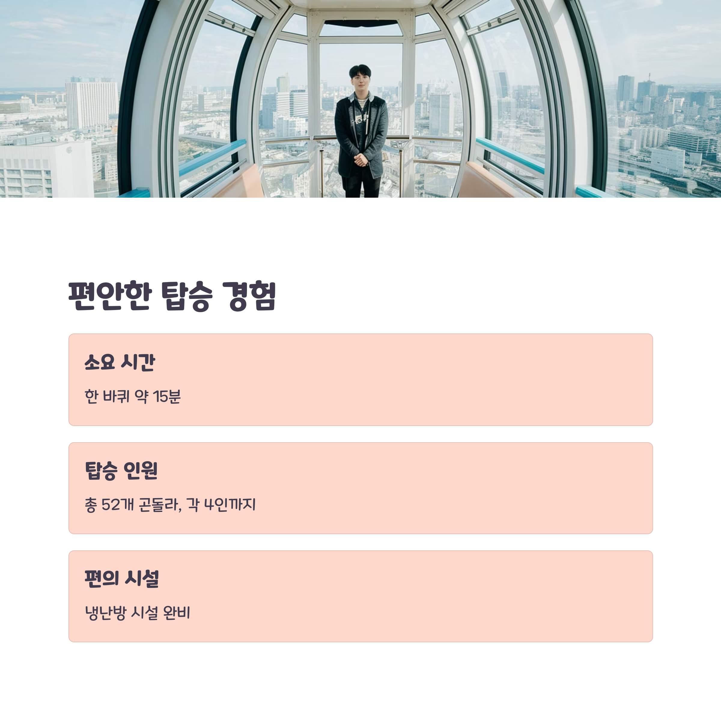 | 햅파이브 관람차는 낮과 밤 각각 다른 매력을 가지고 있습니다. 낮에는 멀리까지 펼쳐진 자연과 도시 전망을 감상하기에 최적입니다. 밤에는 오사카의 화려한 야경과 도시 불빛이 특별한 분위기를 더해줍니다. 곤돌라 선택 시 유리 바닥이 있는 곤돌라를 요청하면 색다른 체험이 가능합니다. 사진 촬영을 원한다면 삼각대나 핸드폰 스탠드를 준비해 가는 것도 좋습니다. |