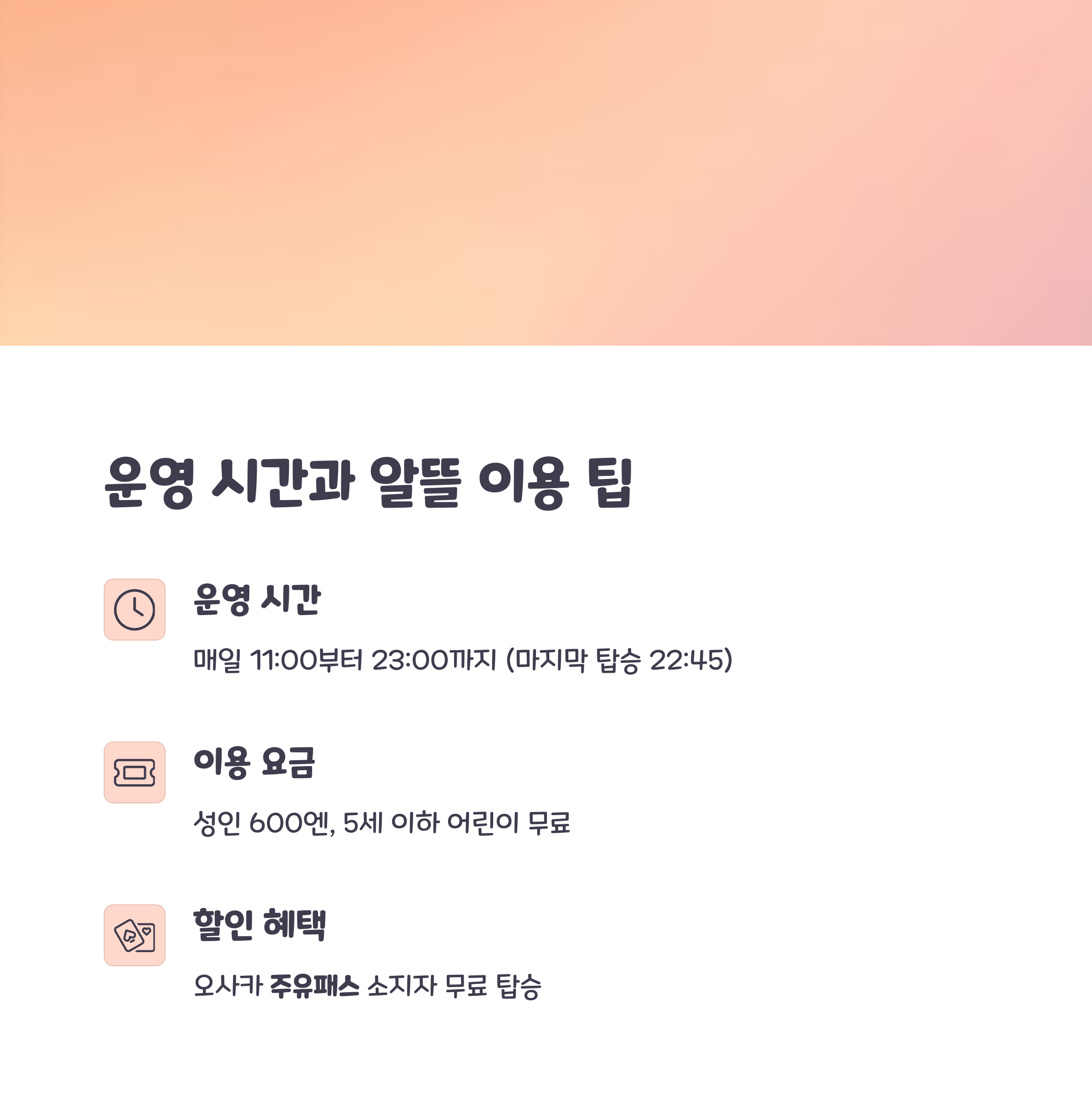 3. 혜택: 오사카 주유패스로 무료 탑승 가능.