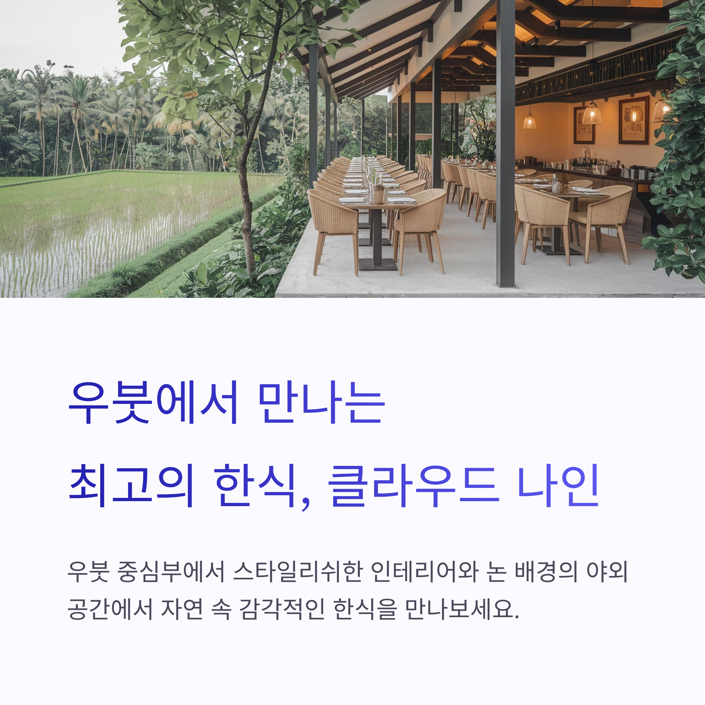 클라우드 나인 우붓은 발리 우붓 여행 중 꼭 들러야 할 한식당으로 현지와 조화로운 인테리어와 다양한 한식을 제공합니다.