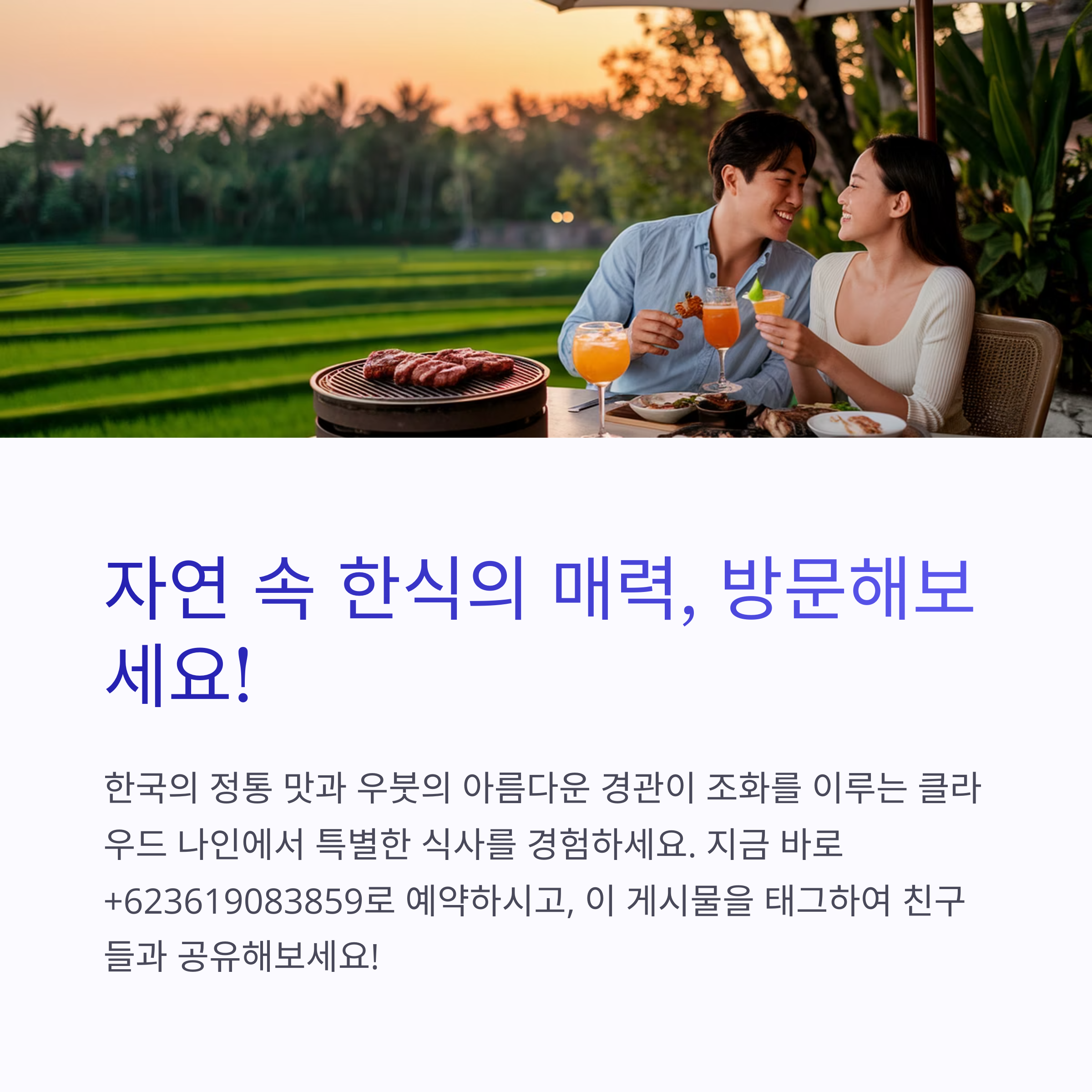 클라우드 나인 우붓은 자연과 한식의 조화를 강조하며, 가격 대비 뛰어난 맛을 제공합니다.