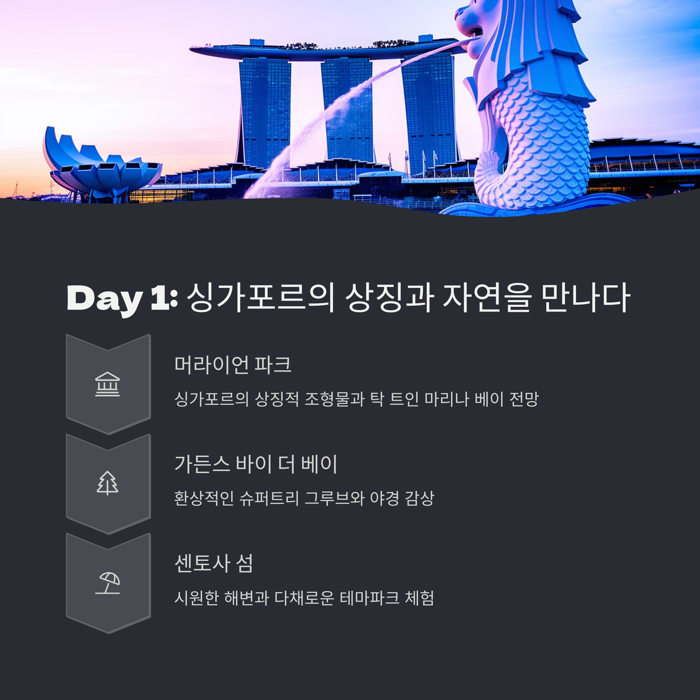 싱가포르의 핵심 코스를 중심으로 효율적인 여행 동선을 설계하면 모든 명소를 빠르게 탐방할 수 있습니다.