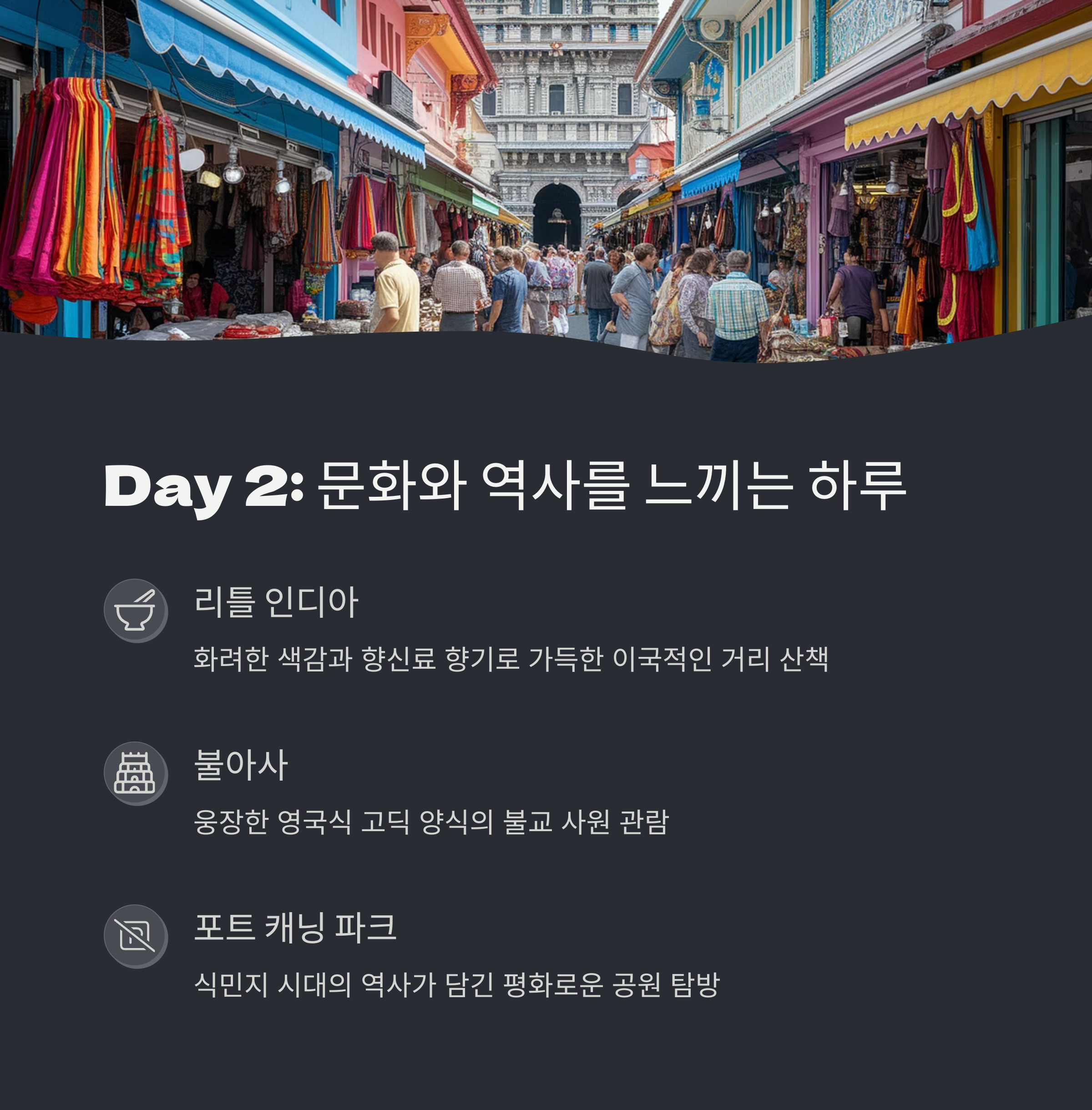 2일 차는 문화적으로 독특한 리틀 인디아를 탐험하며 인상적인 건축과 독특한 음식을 맛보세요.