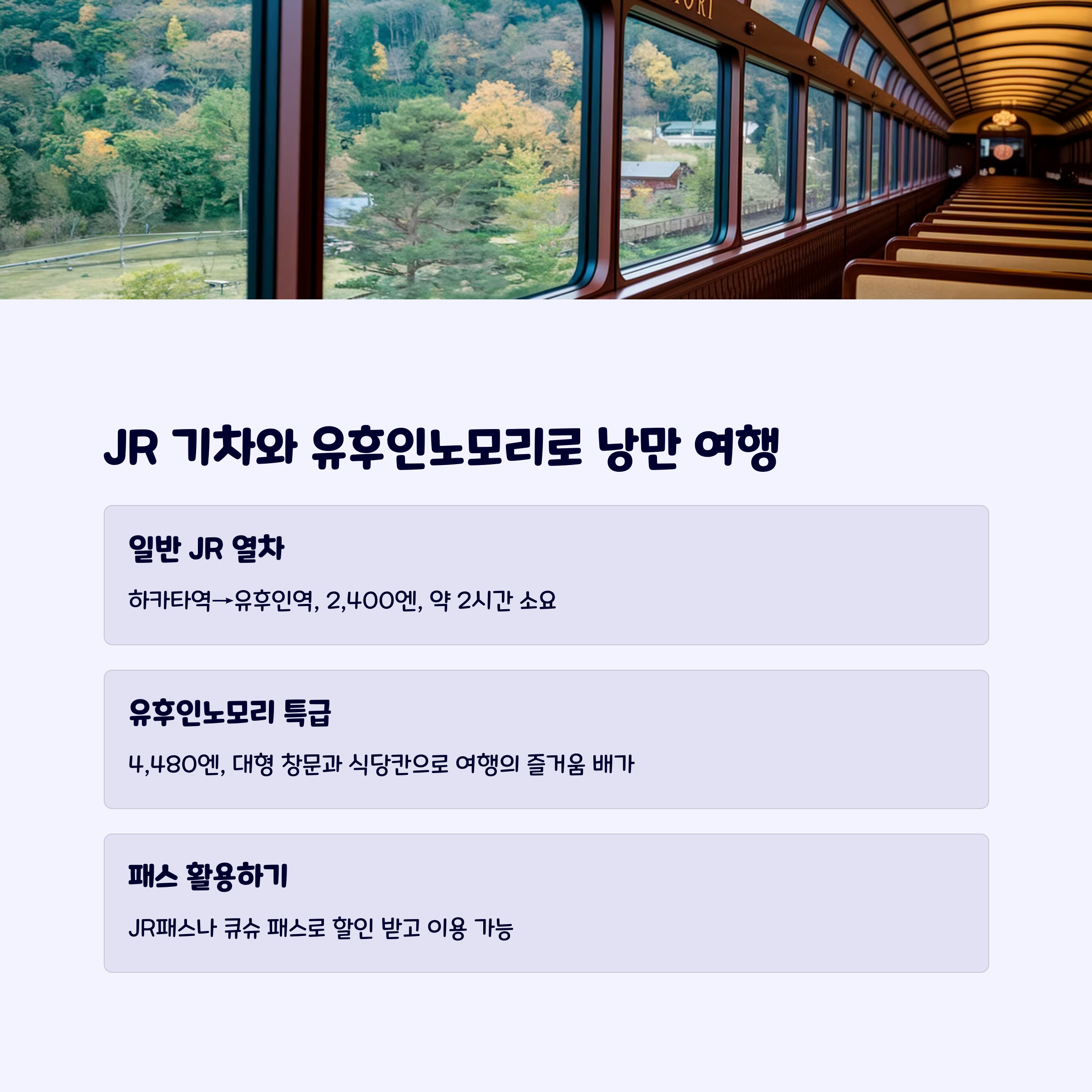 반면, JR 열차의 경우 유후인노모리 등의 관광 열차가 있어, 편안한 좌석즐길 거리를 제공하지만 추가 비용이 발생합니다.