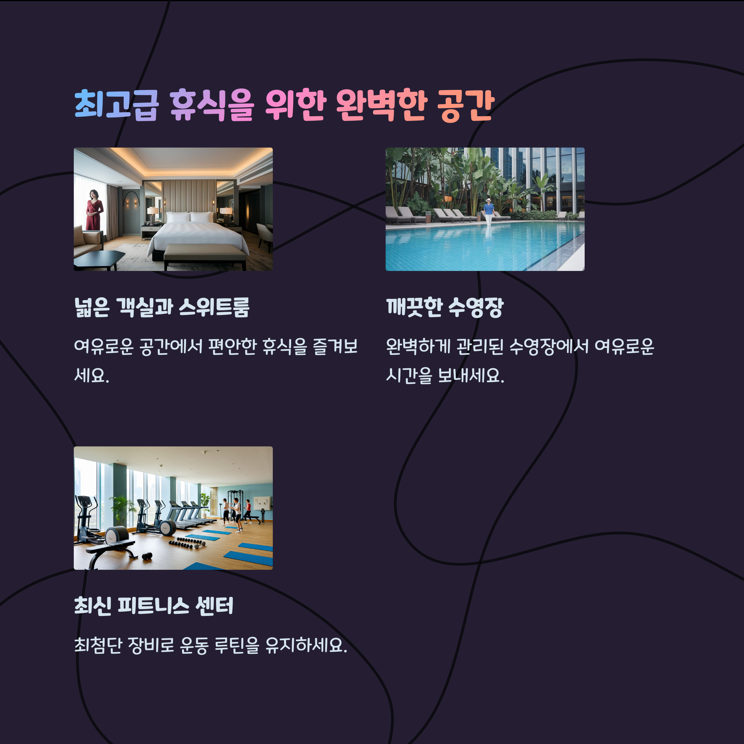 온수 실외 수영장이나 최신 피트니스 시설 등도 투숙객들의 휴식과 취미를 위해 최적화되어 있습니다.