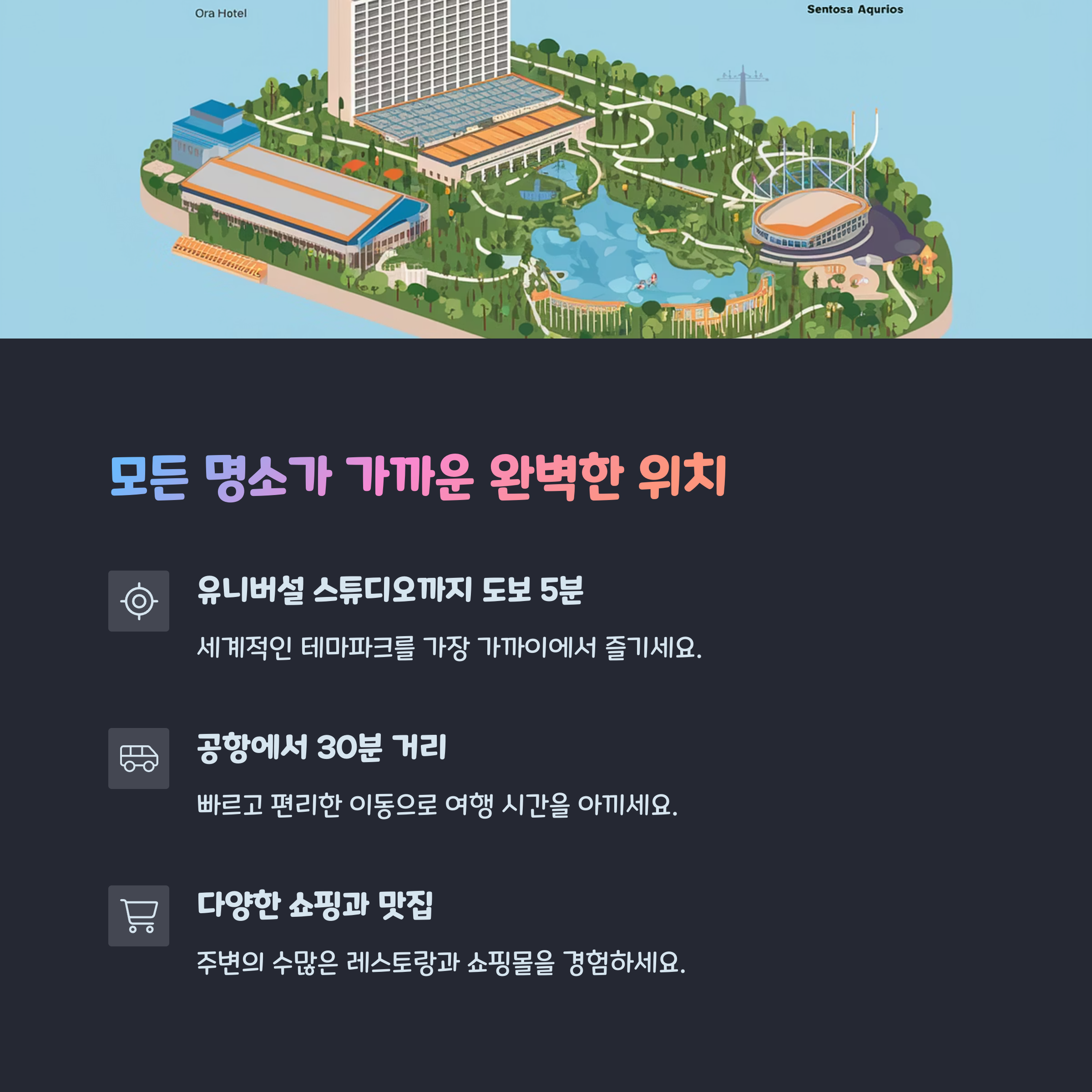 | 오라 호텔은 주변 레저 시설과의 접근성이 매우 뛰어납니다. 유니버설 스튜디오 입장은 호텔에서 도보로 이동이 가능하며, *익스트림 어트랙션*을 즐길 수 있습니다. 아쿠아리움에서는 독특한 해양 생물을 가까이에서 볼 수 있습니다. 어드벤처 코브 워터파크는 물놀이와 *스릴 넘치는 어트랙션*을 제공합니다. 센토사 모노레일을 활용해 주변 레스토랑 또는 해변 방문도 추천드립니다. |