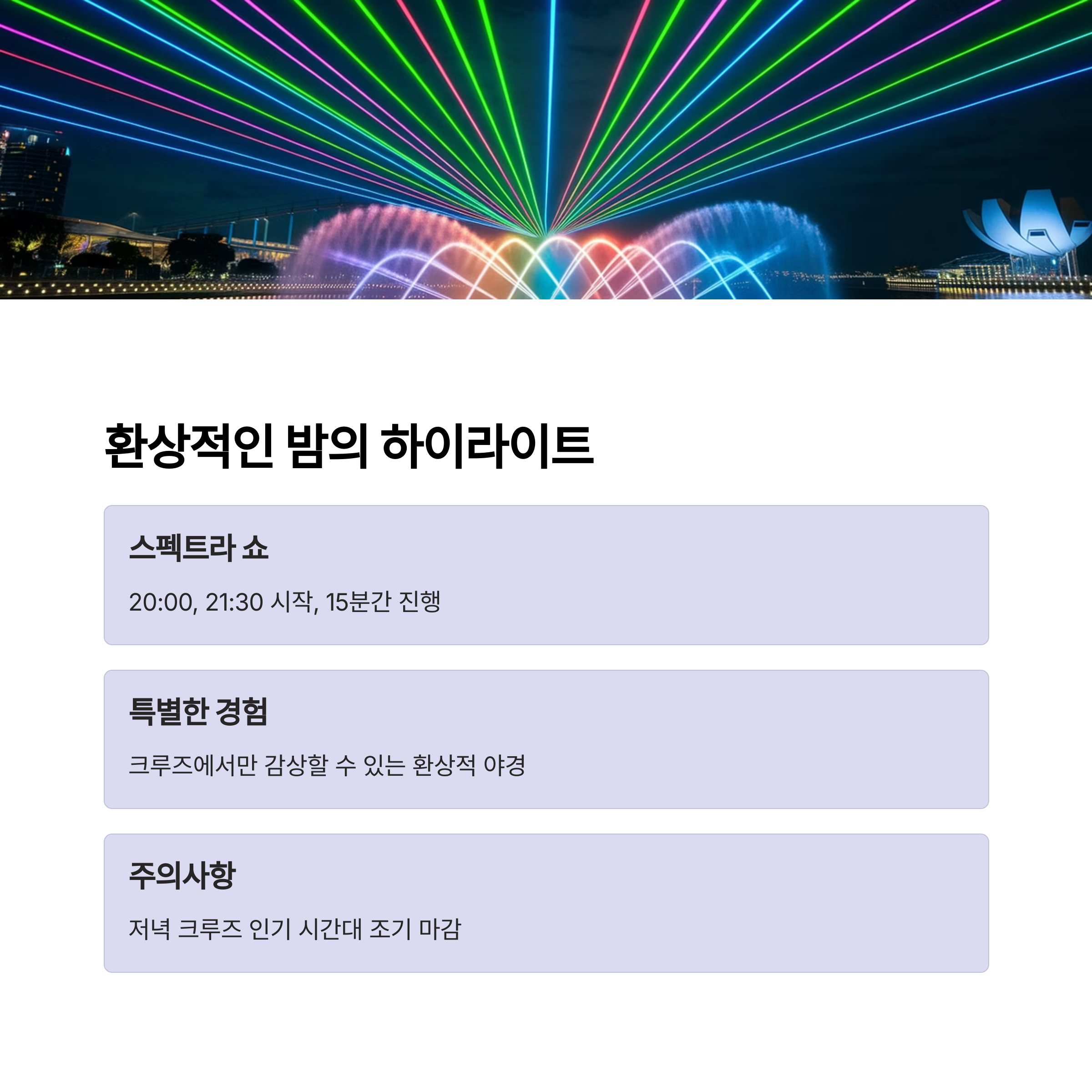 크루즈 주요 코스에서는 마리나 베이 샌즈, 머라이언 동상과 같은 명소를 감상할 수 있습니다.