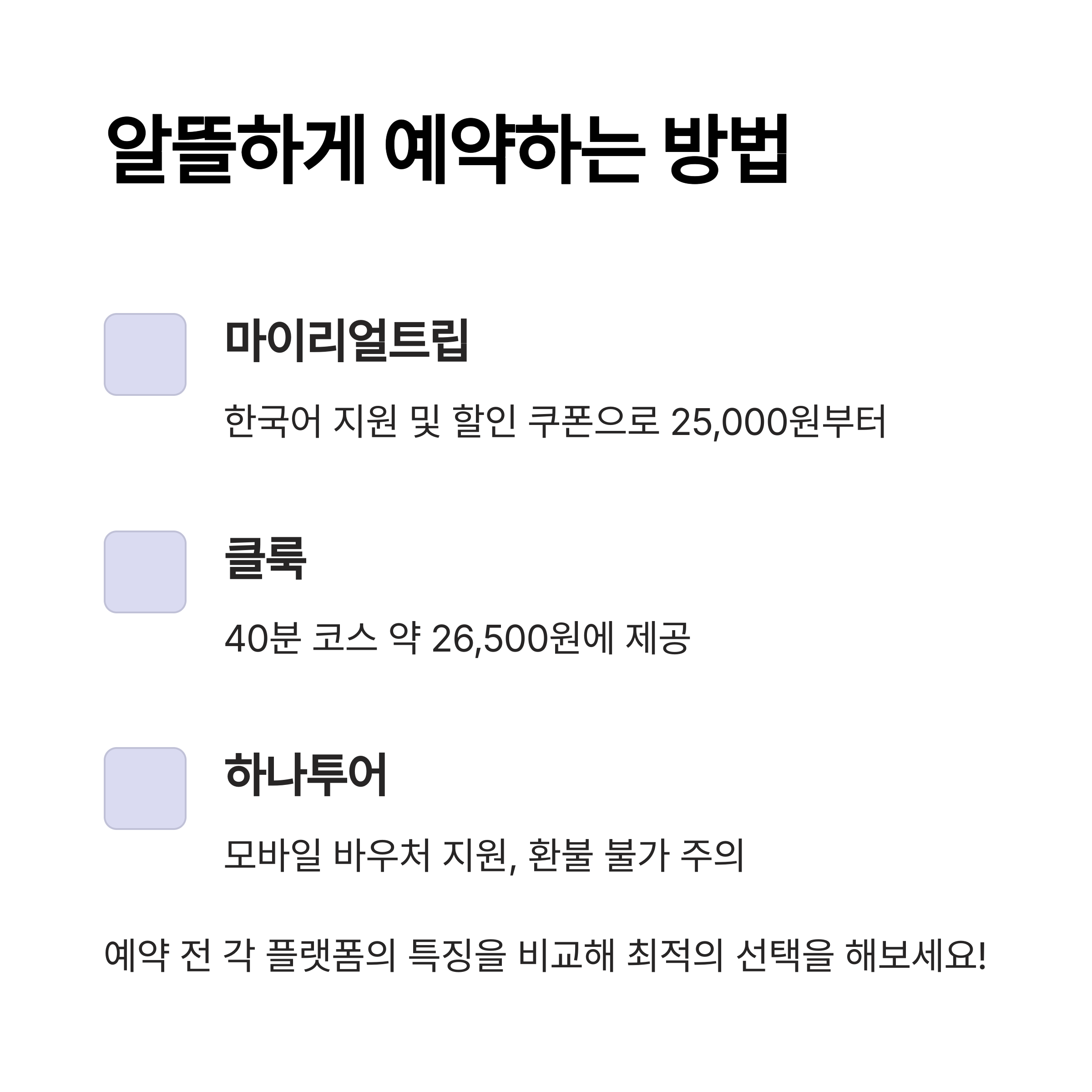 | 예약 가능 플랫폼 | 마이리얼트립, 클룩, 하나투어 |