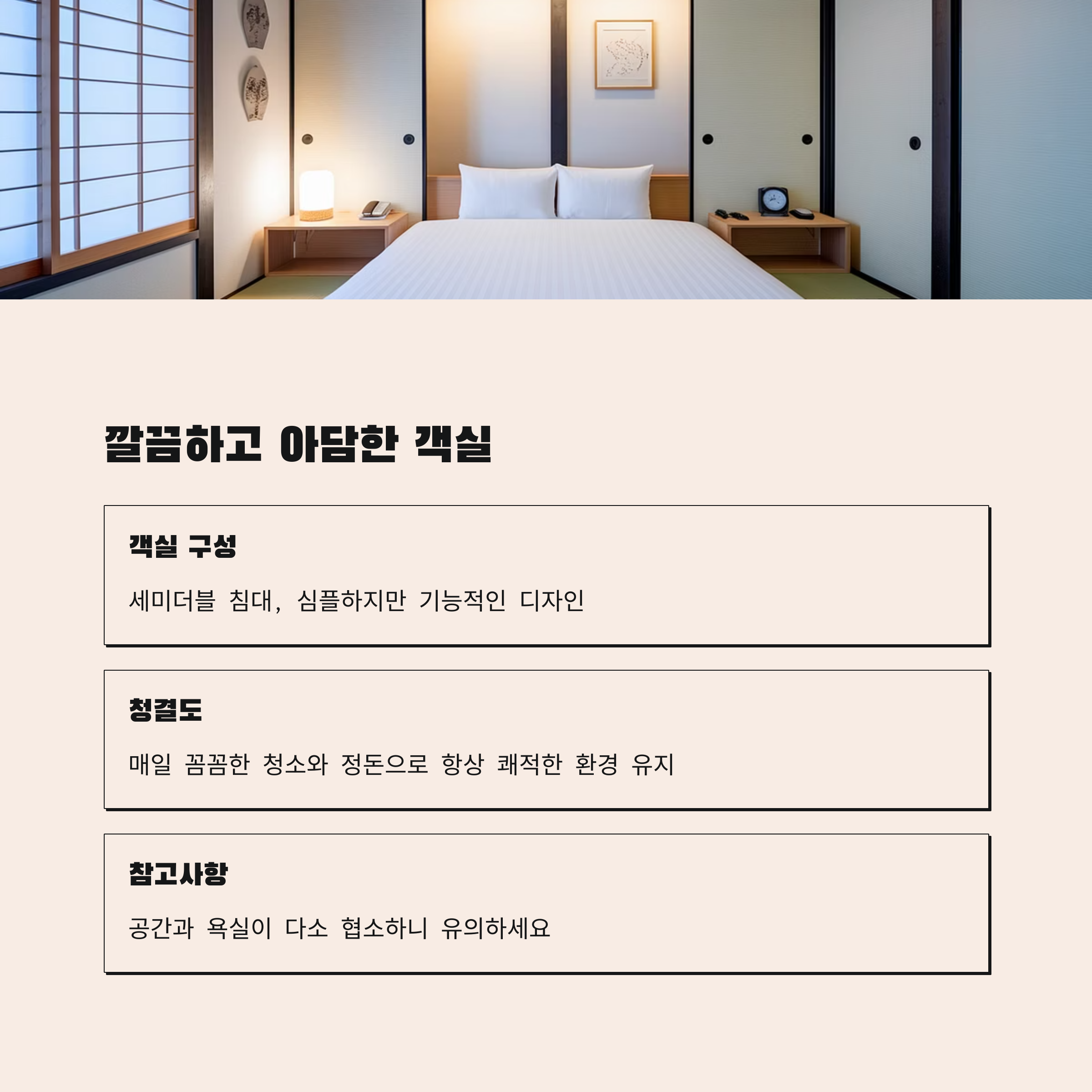 단, 객실이 작은 편인 만큼 편안한 수면 환경과 소득 대비 최적화된 가치를 찾는 여행객에게 이상적입니다.
