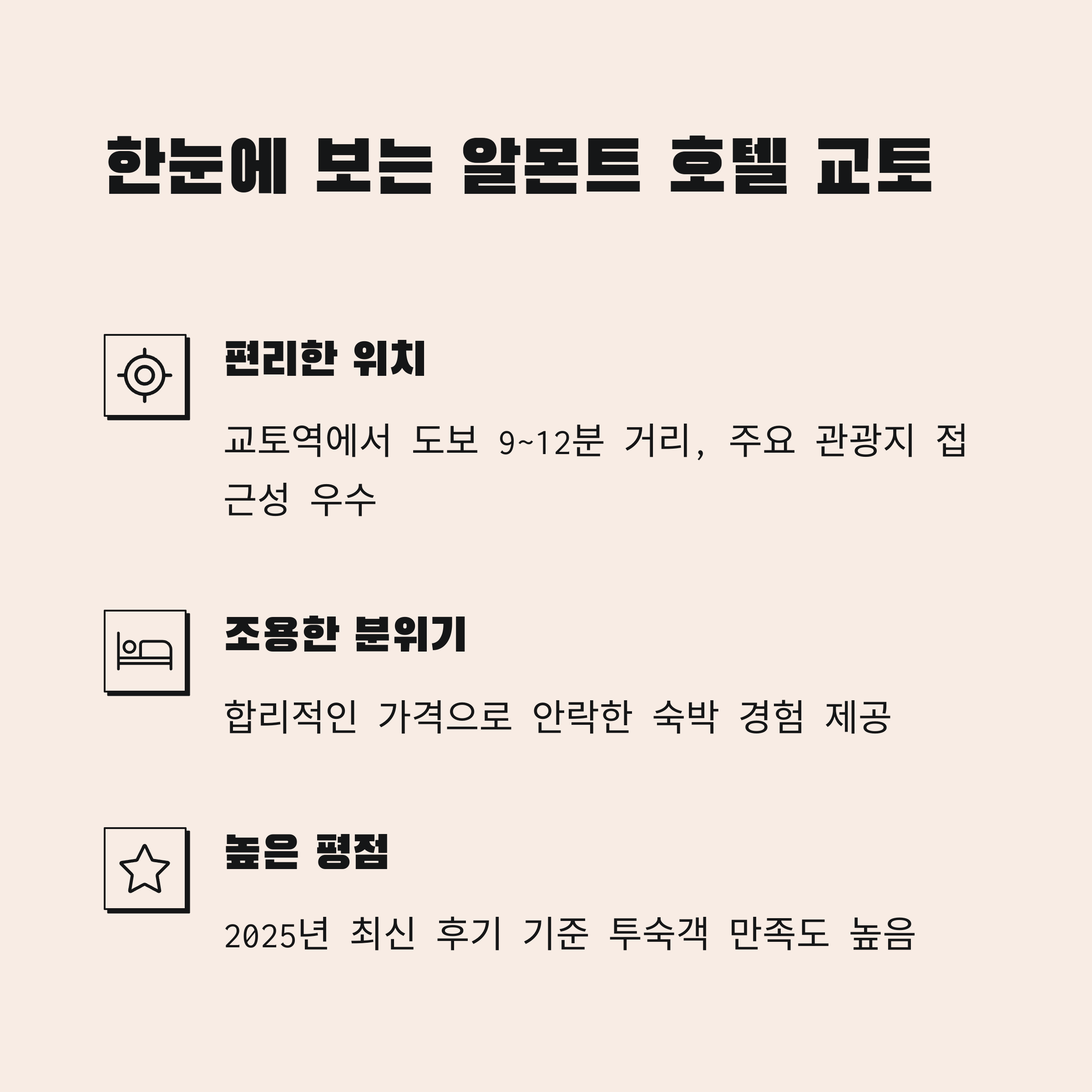 결국 이 모든 장단점을 종합했을 때, 알몬트 호텔 교토는 효율성 높은 숙박 옵션을 제공합니다.