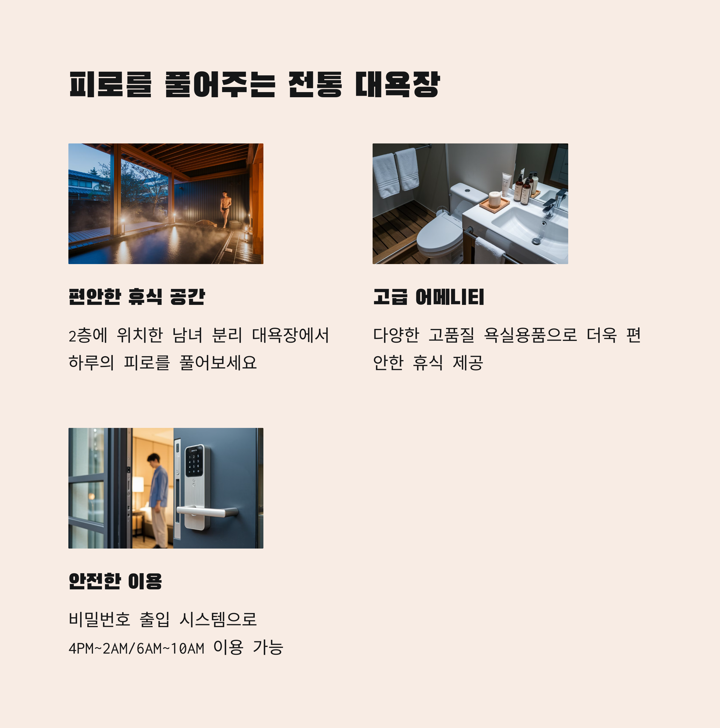 대욕장은 숙박의 큰 장점으로, 여행의 피로를 풀고 몸과 마음을 재충전할 수 있는 공간입니다.