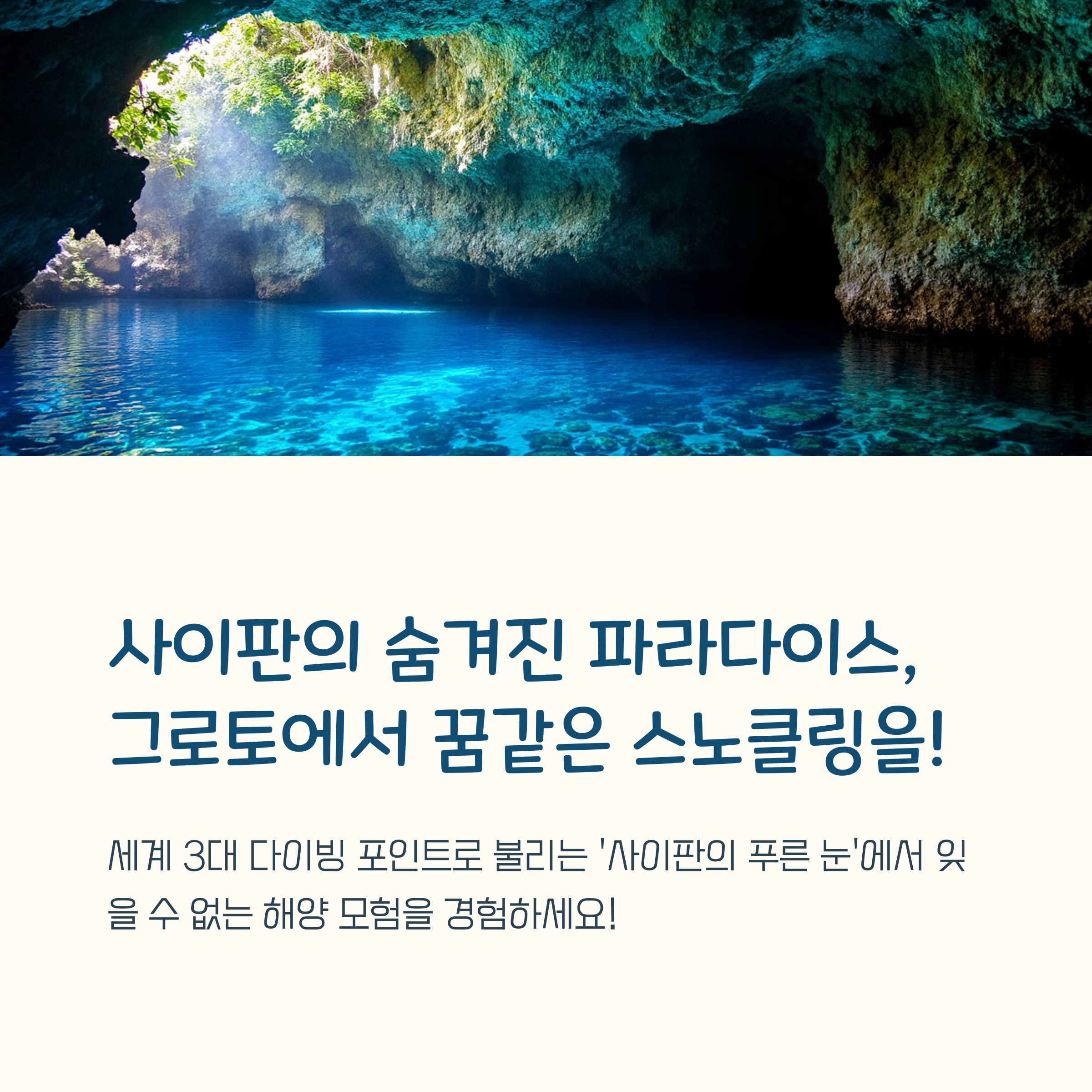 오늘은 사이판 여행 중 가장 독특한 경험 중 하나인 그로토 스노클링 투어를 소개해 드리겠습니다.