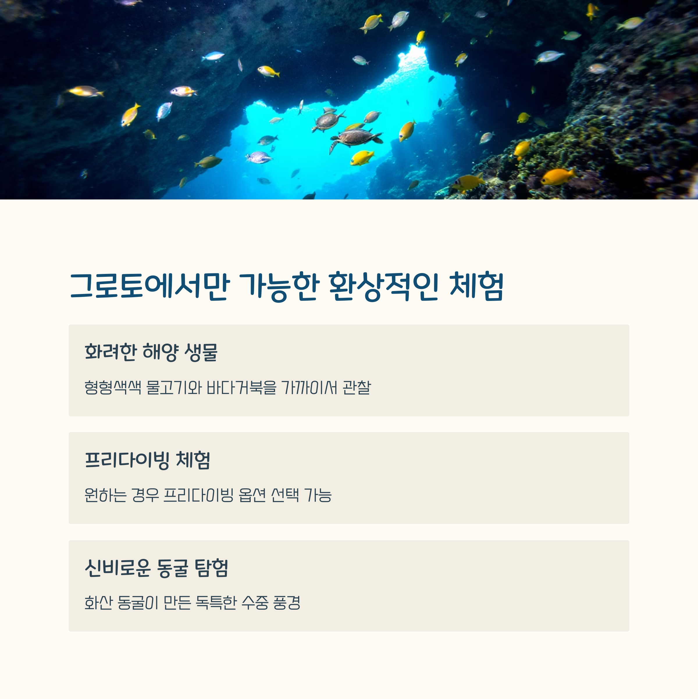 | Q. 그로토 스노클링 투어에서 프리다이빙 옵션은 어떻게 구성되나요? |