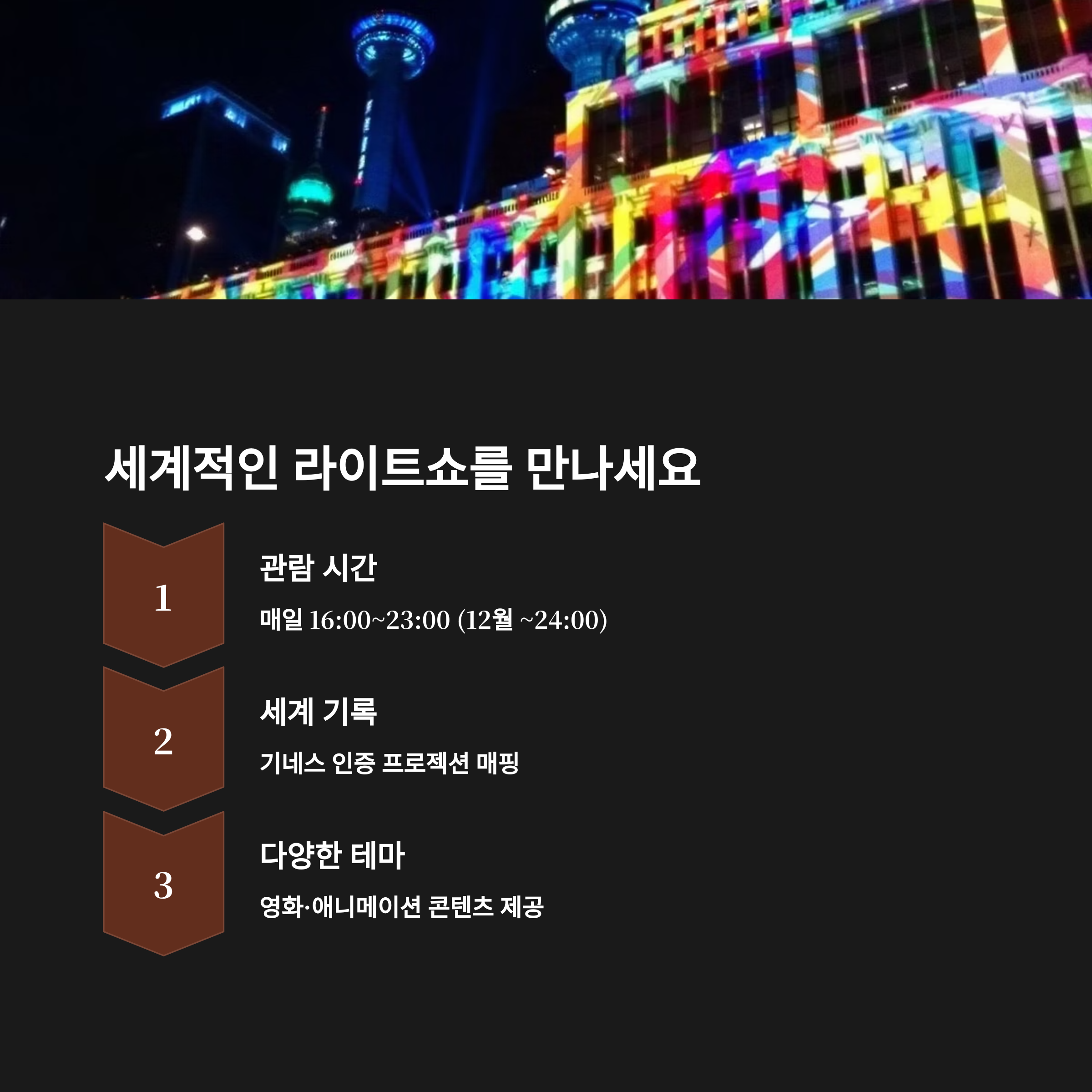 | 프로젝션 매핑 | 16:00 ~ 23:00 | 테마별 대형 이벤트 | 연중 상시 |