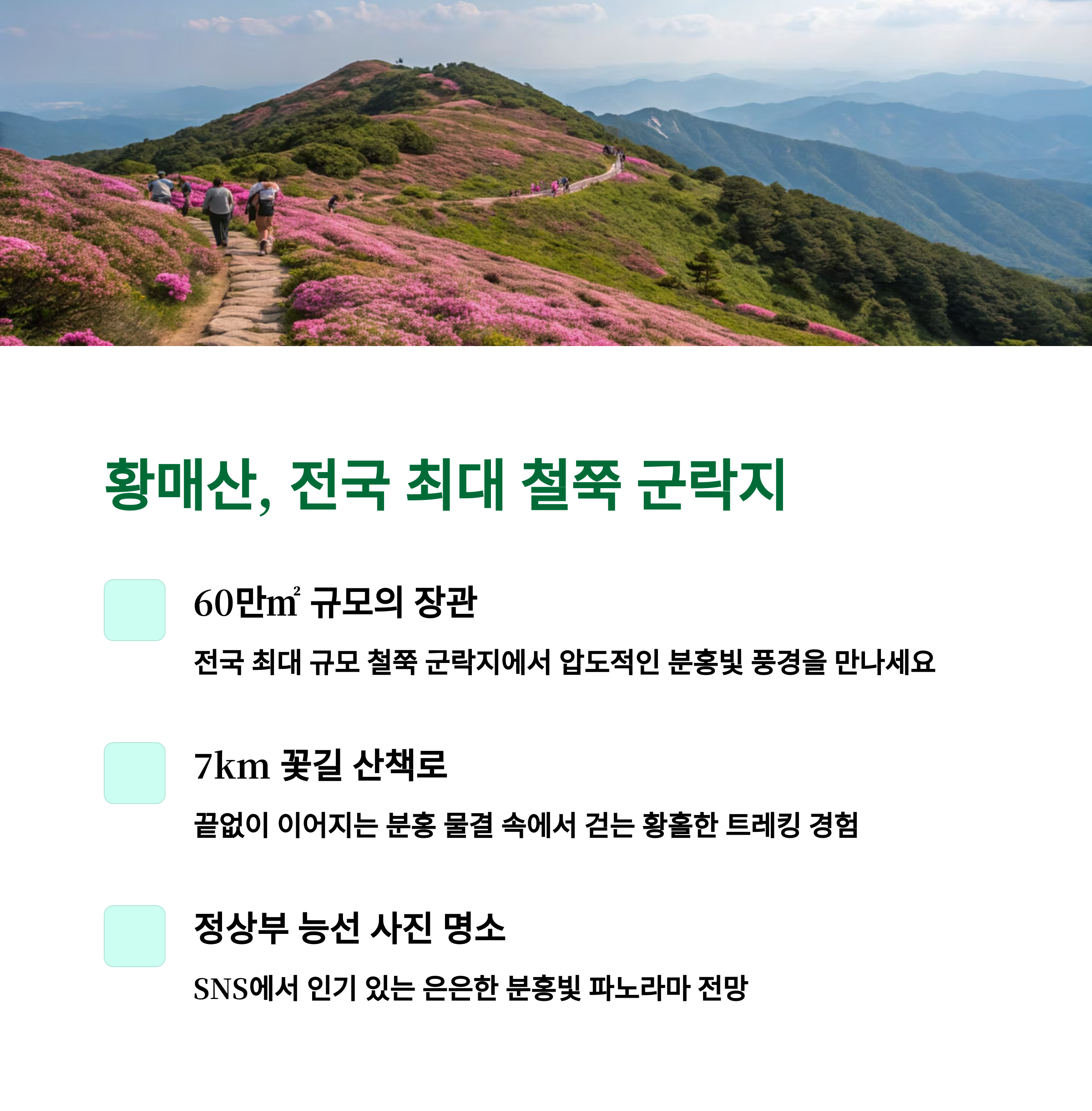 - 추천 코스2: 주차장 → 철쭉 군락지 → 황매산 정상 (왕복 2~3시간)
