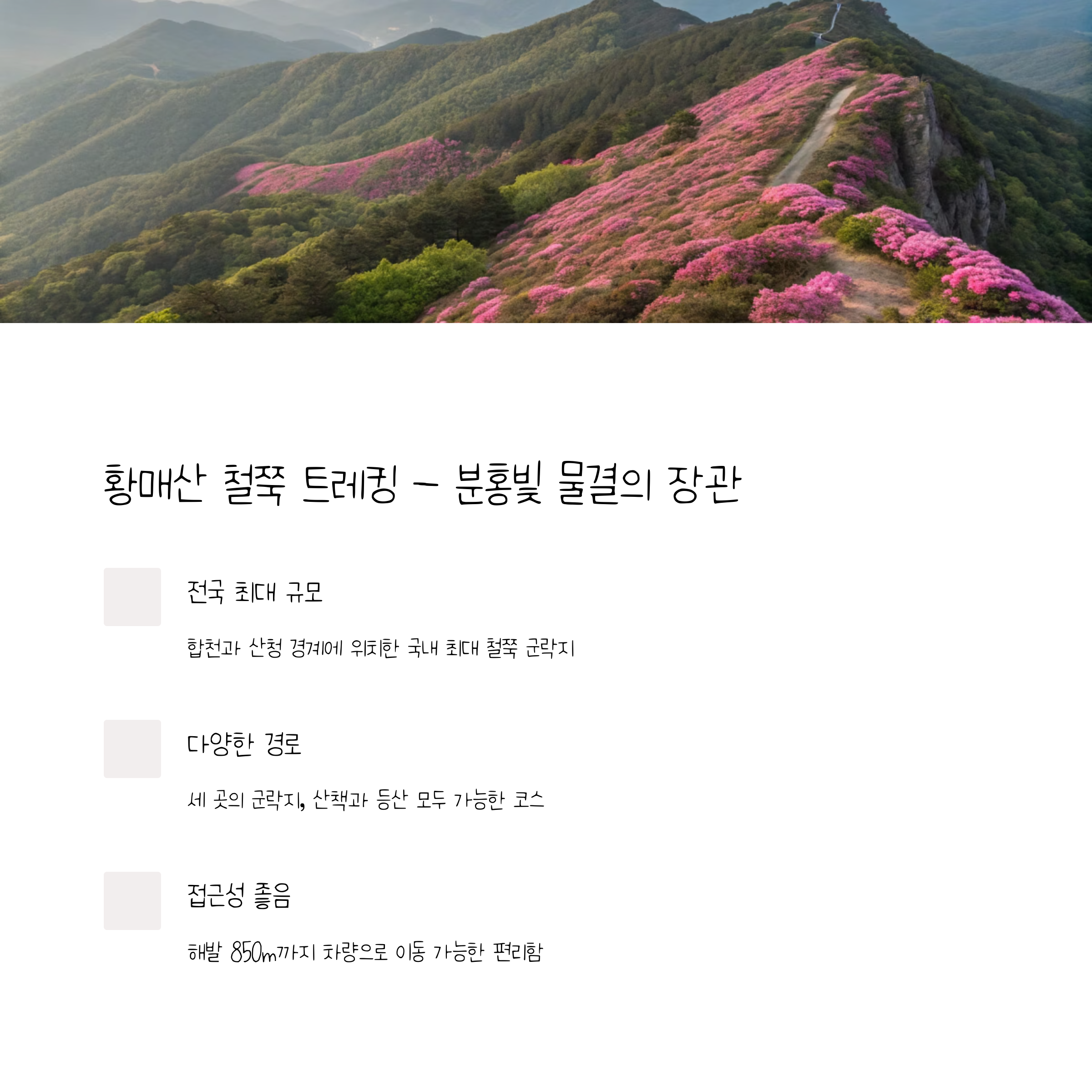 | 도보 가능한 철쭉 트레킹: 황매산·봉화산 등산 가이드 (1) | 2025.05.01 |