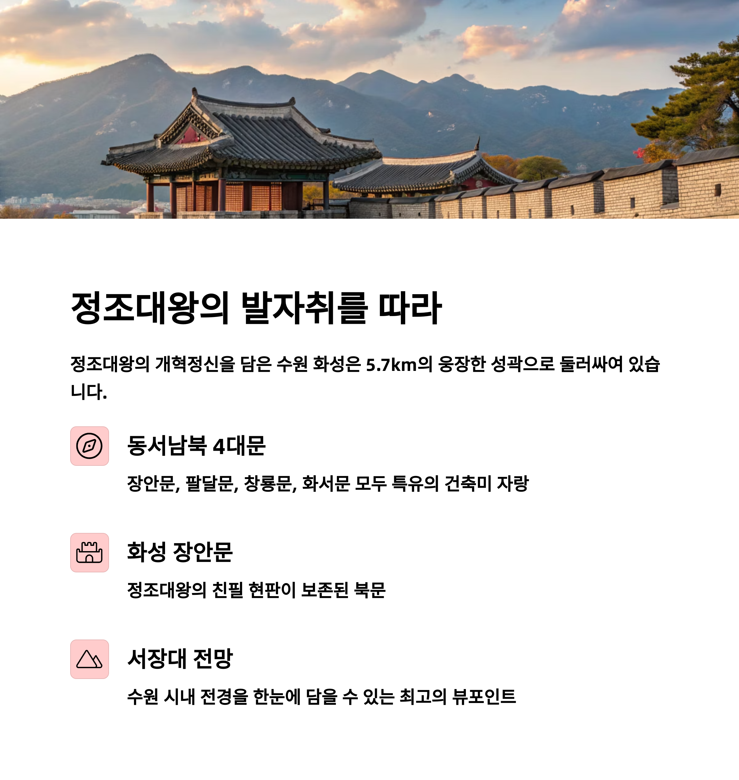 - 연인 코스: 행궁동 카페 → 수원화성 걷기 → 저녁 무렵 야경 산책