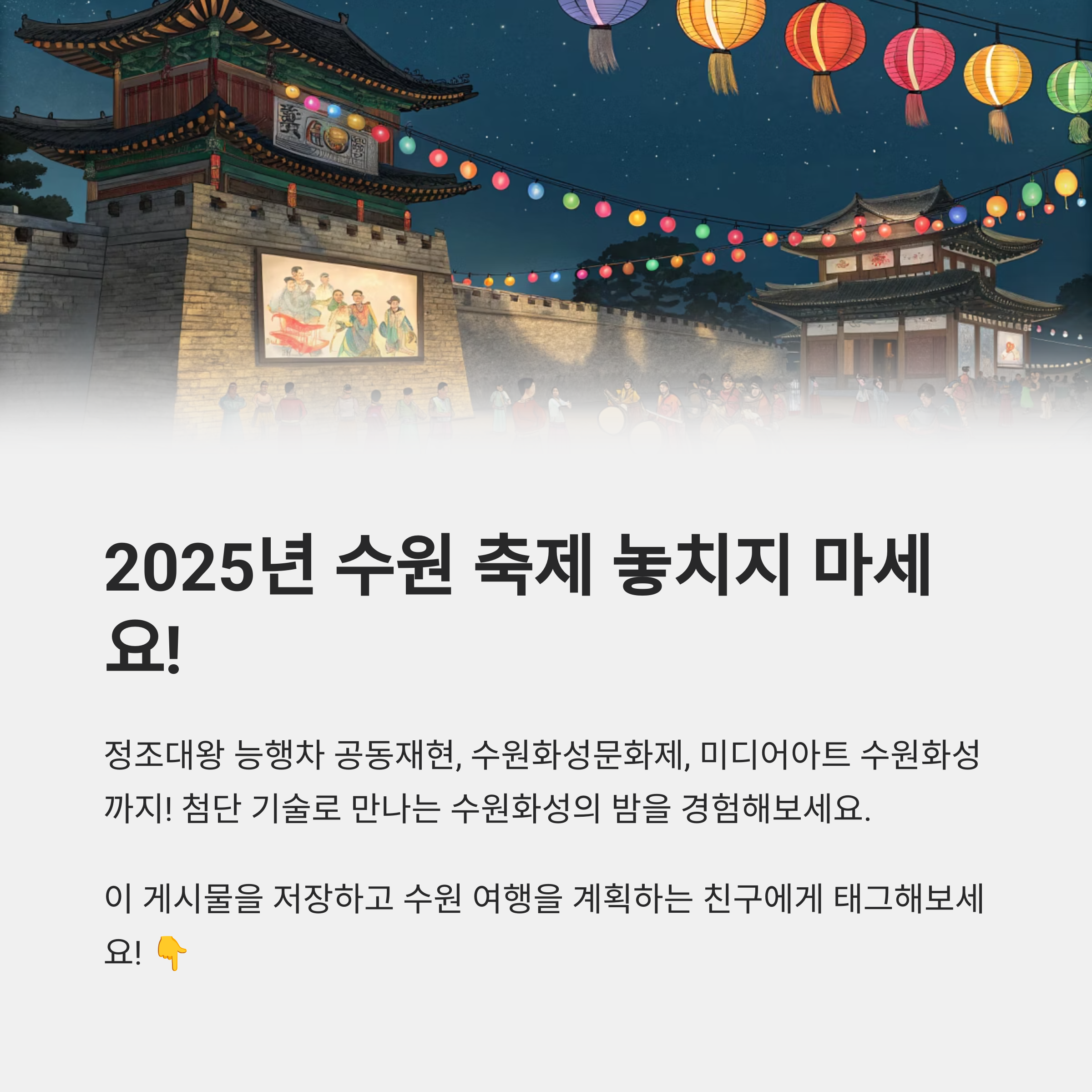 “낮엔 역사, 밤엔 문화… 수원의 매력은 24시간 유효합니다.” 🎇🎭