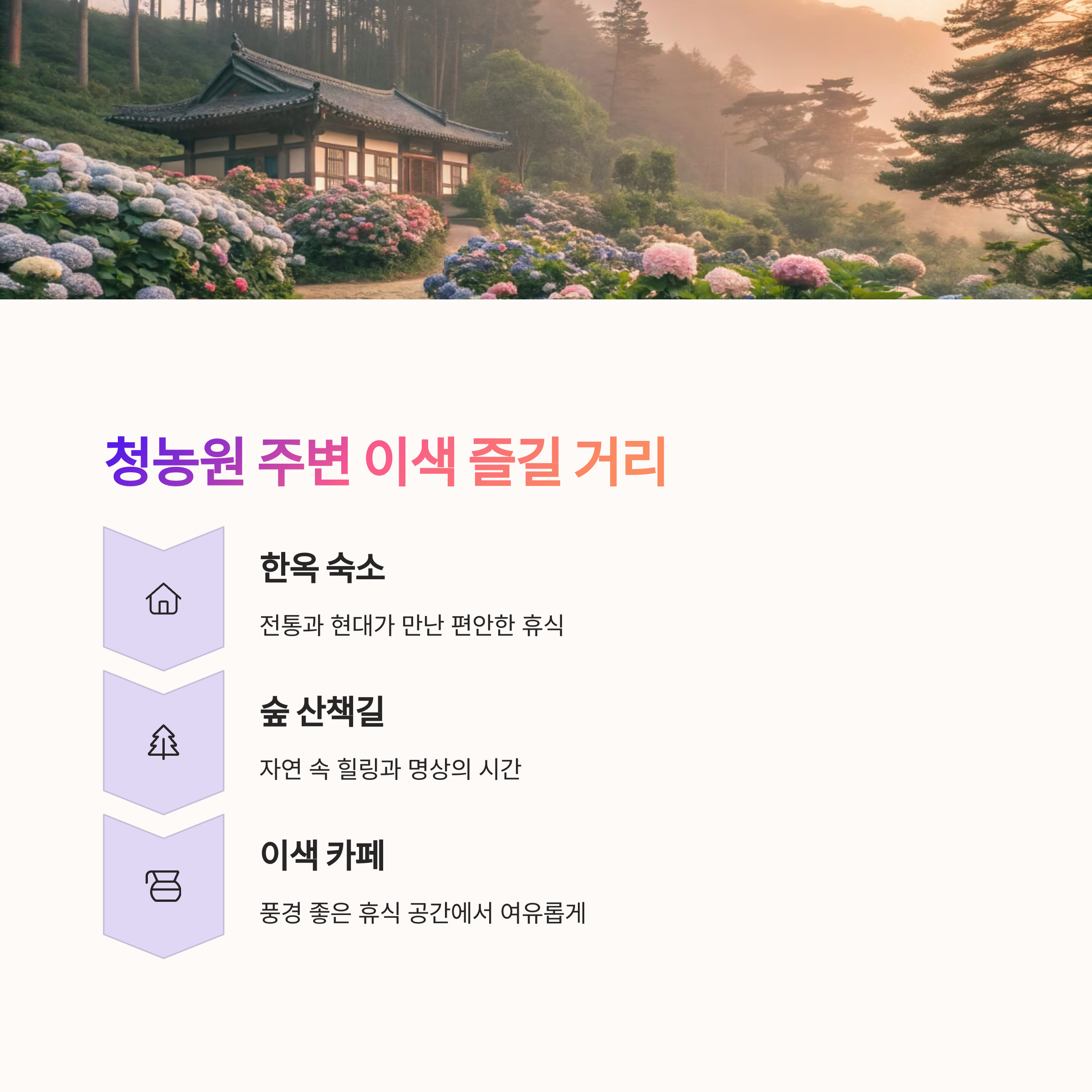 청농원 주변 즐길 거리 - 수국정원, 한옥숙소, 숲 산책길