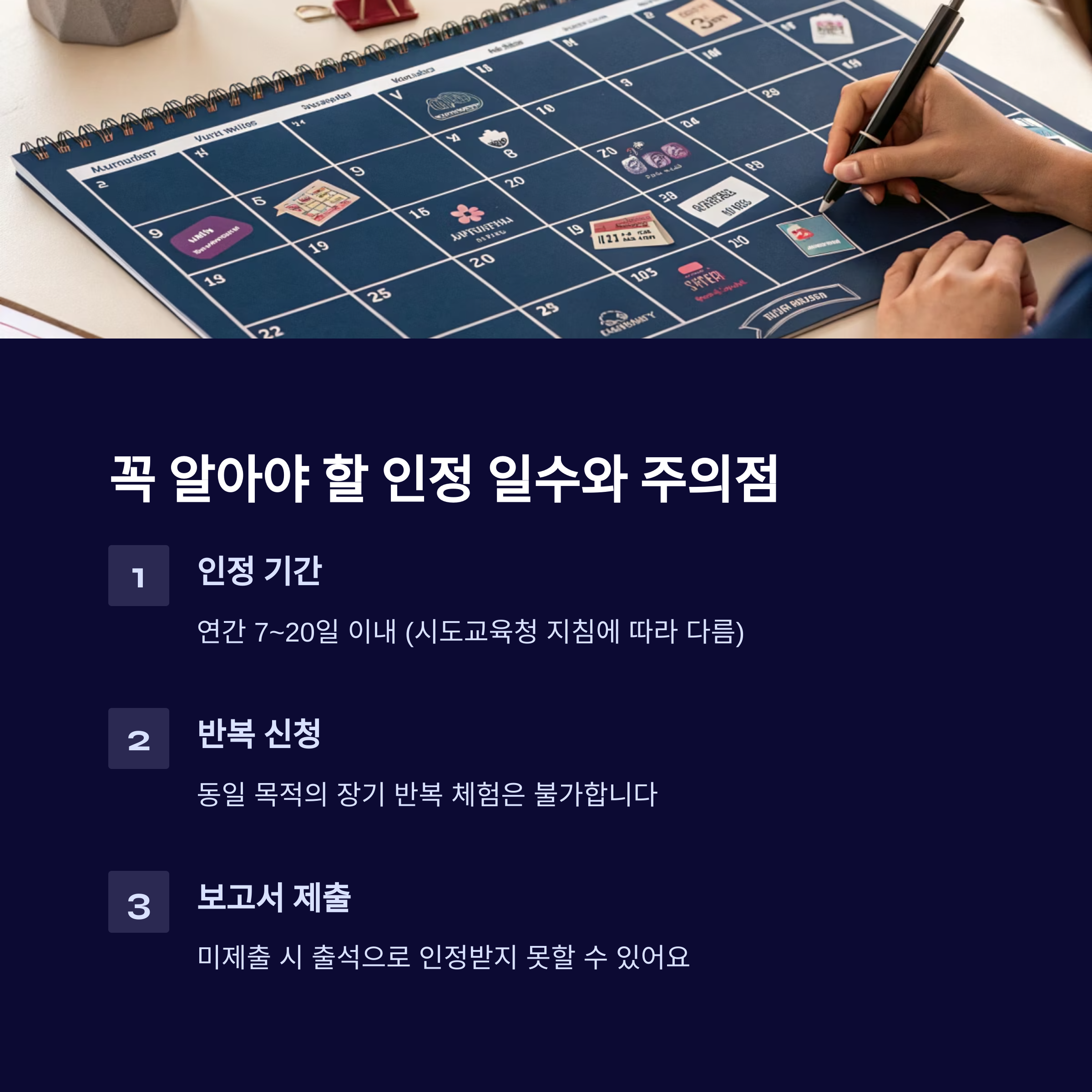 - 연속 체험일수가 많을 경우, 학습 결손 우려로 불승인 가능