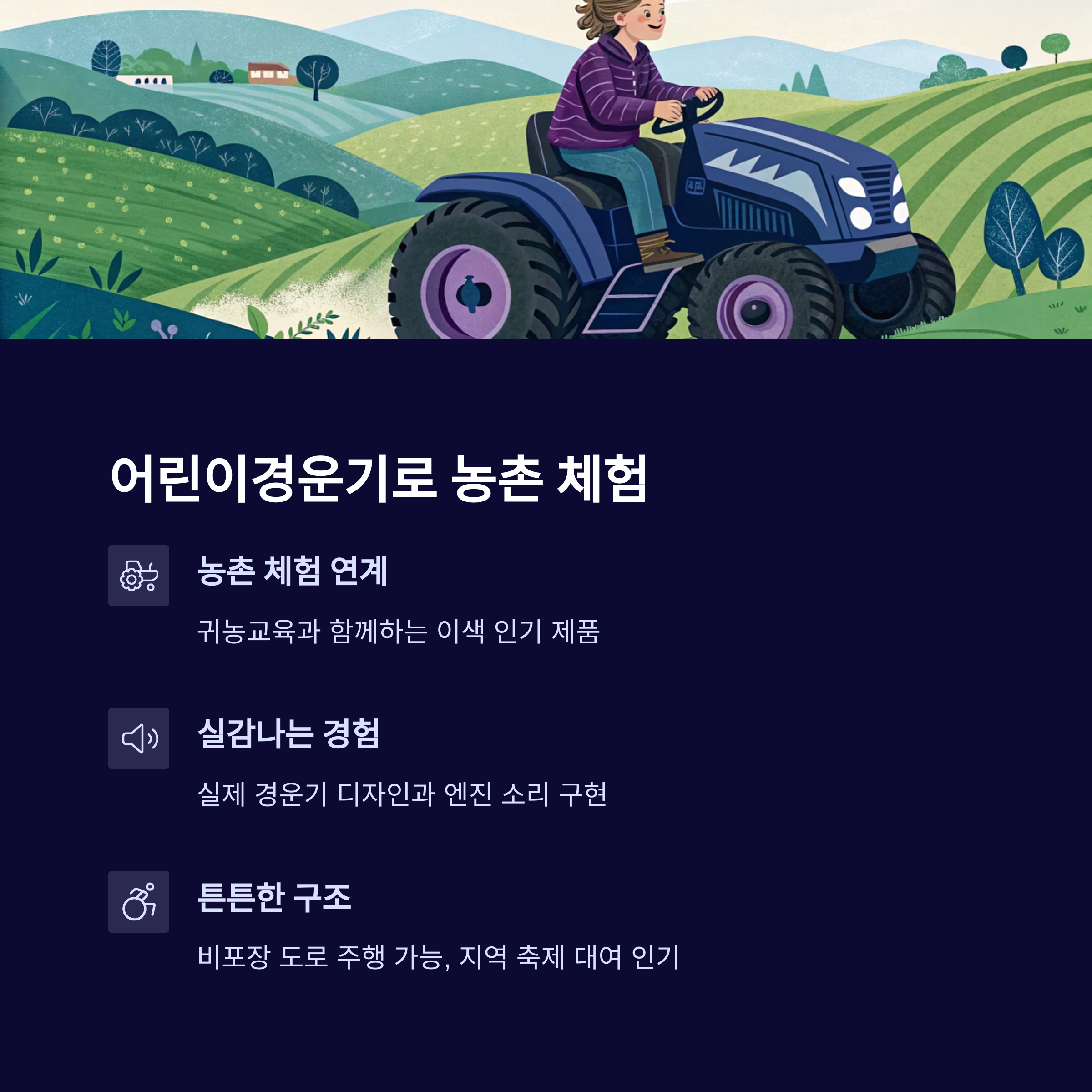| 6~8세 | 어린이 경운기 | 버튼 조작, 사진용 인기도 높음 |
