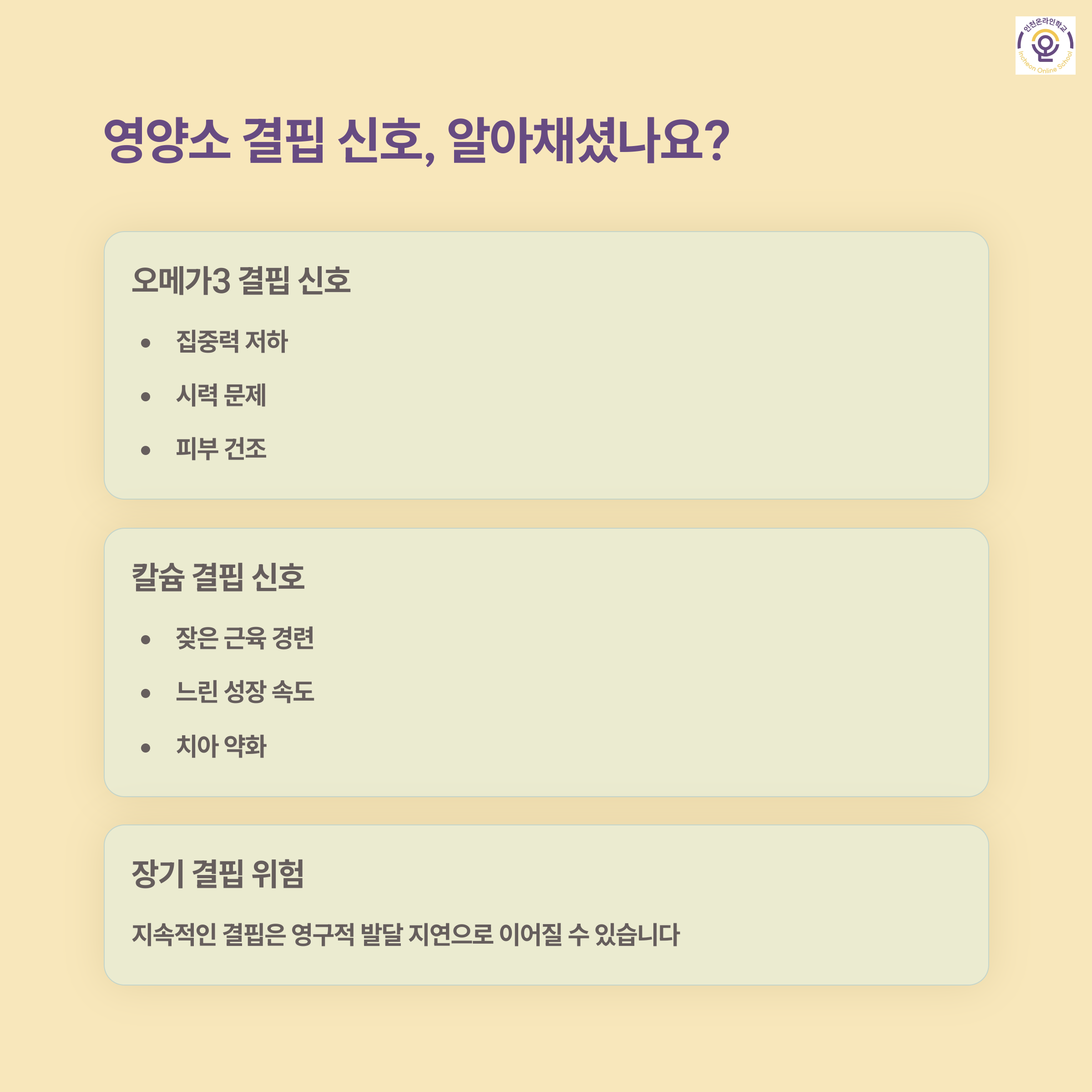 | 칼슘 | 성장 둔화, 근육 경련, 손발 저림, 잇몸 약화 |