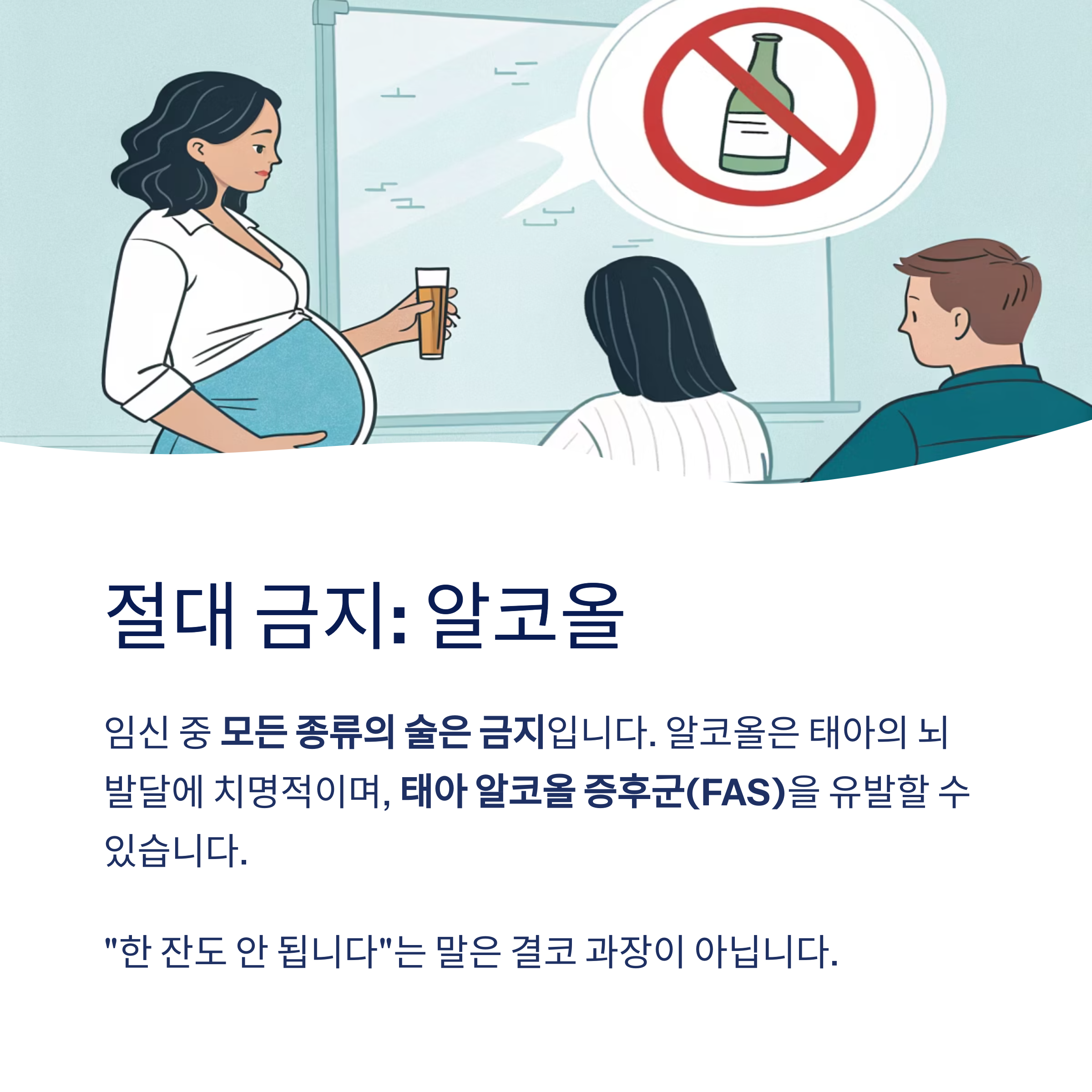 알코올은 태아의 뇌 발달에 치명적이며, **태아 알코올 증후군(FAS)**을 유발할 수 있습니다.